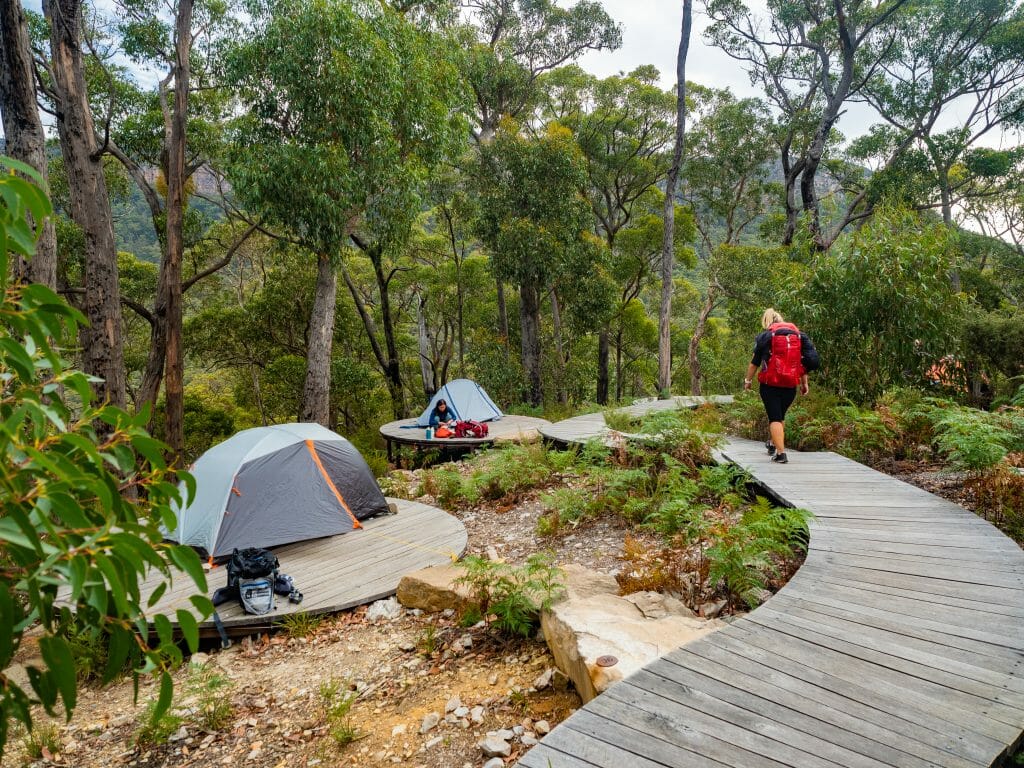 After a series of smaller ascents and descents across rocky terrain, the trail descends slightly into Bugiga Hiker Camp, a purpose-built campsite nestled among the bush and a comfortable place to rest after a challenging but incredibly scenic first day.