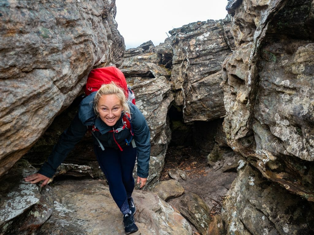 After an incredibly scenic start to the Grampians Peaks Trail yesterday, our second day involves even more expansive views of the range! Leaving Bugiga Hiker Camp, the trail climbs steadily through forest before becoming increasingly rugged as you approach Mt Rosea. This is one of the most adventurous sections of the entire route, with rock scrambling, narrow tunnels, and cave-like formations requiring hands-on navigation as you work your way towards the summit.