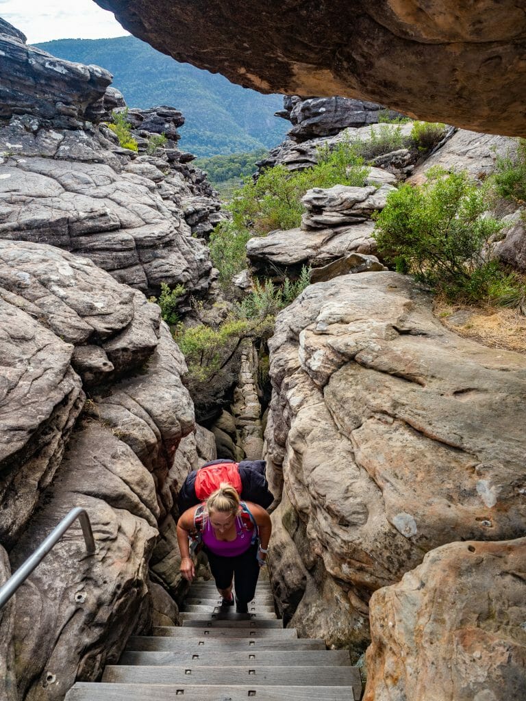 For the vast majority of both day 1 and day 2 on the Grampians Peaks Trail, expect to be walking on rock rather than an actual dirt track. Sometimes this is in the form of stone steps, but mostly you’ll just be directly on large sheets of sandstone.