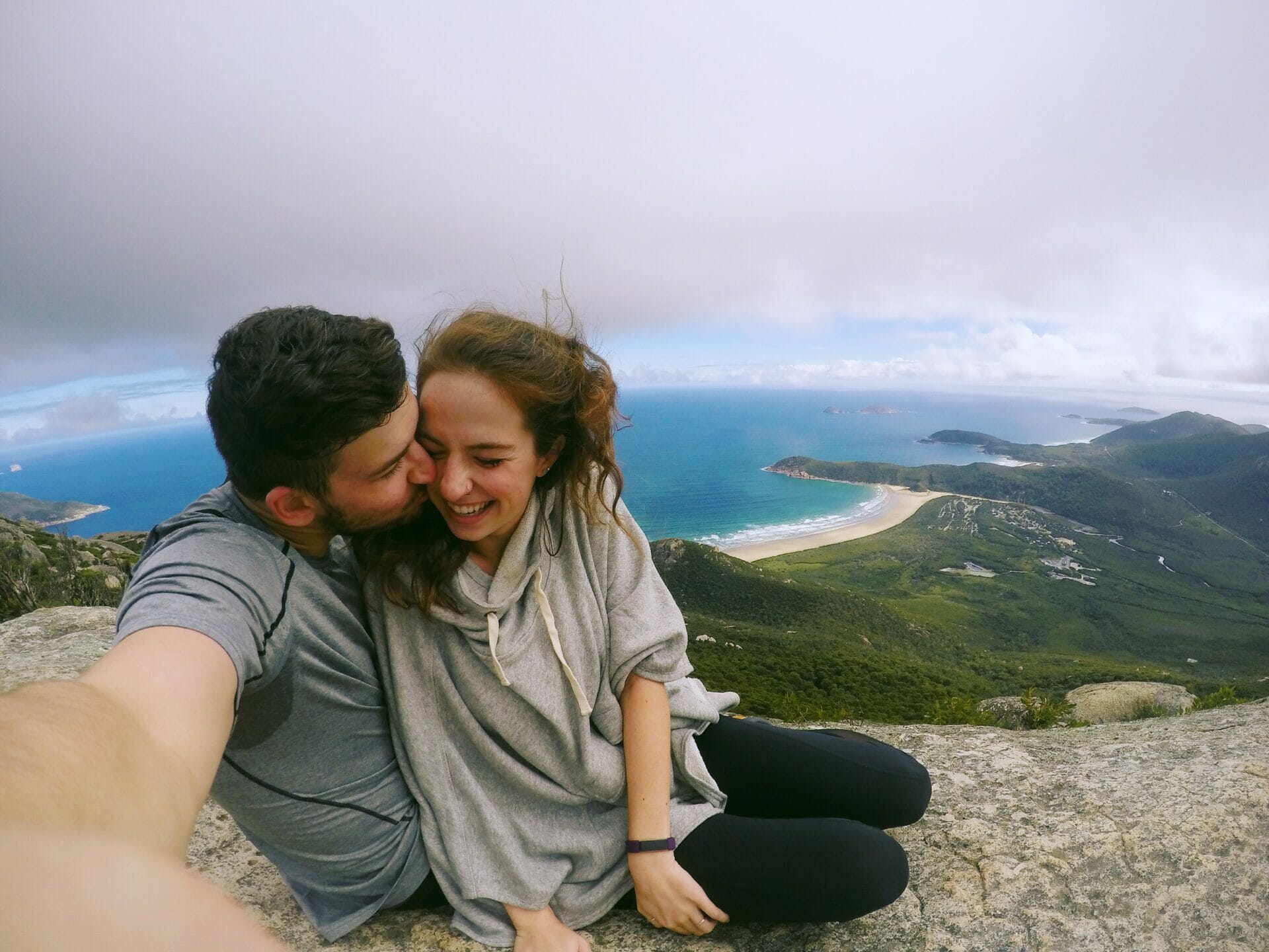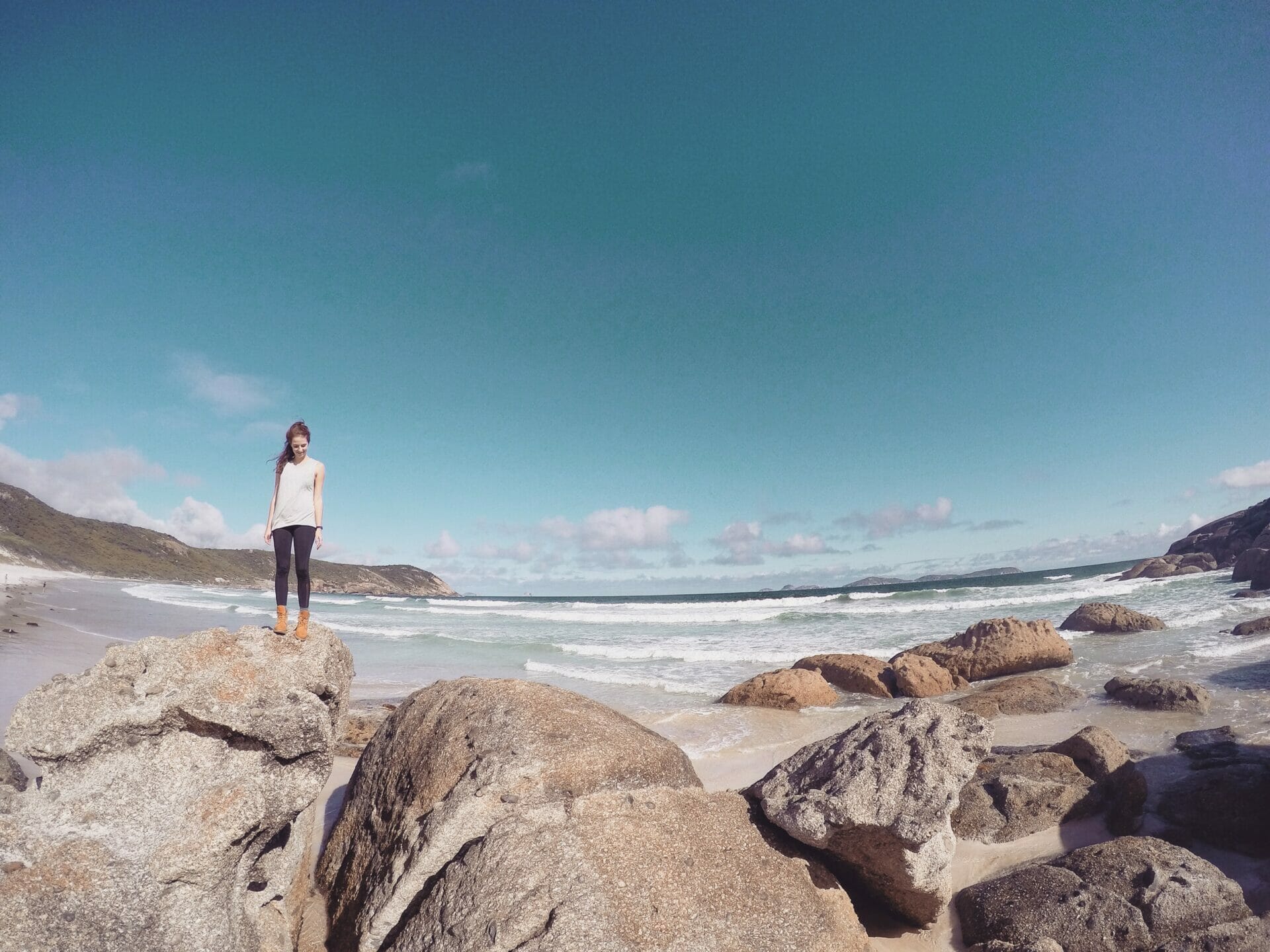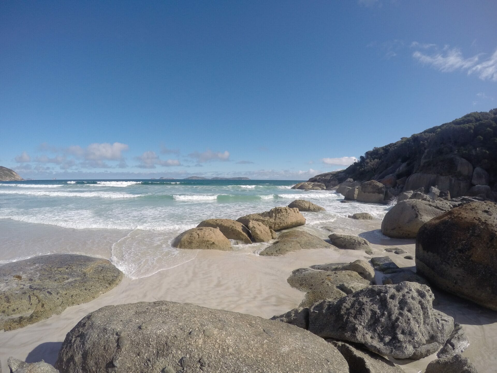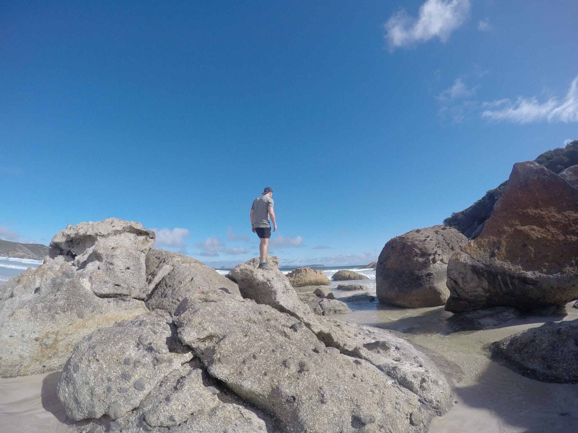On our way back down, we detour to Squeaky Beach, the inviting strip of sand that we could see from our rock perch, and have a bit of a play climbing the boulders. Of course, now that we’ve hiked back down, the clouds seem to be clearing and the sun is out in full-force.