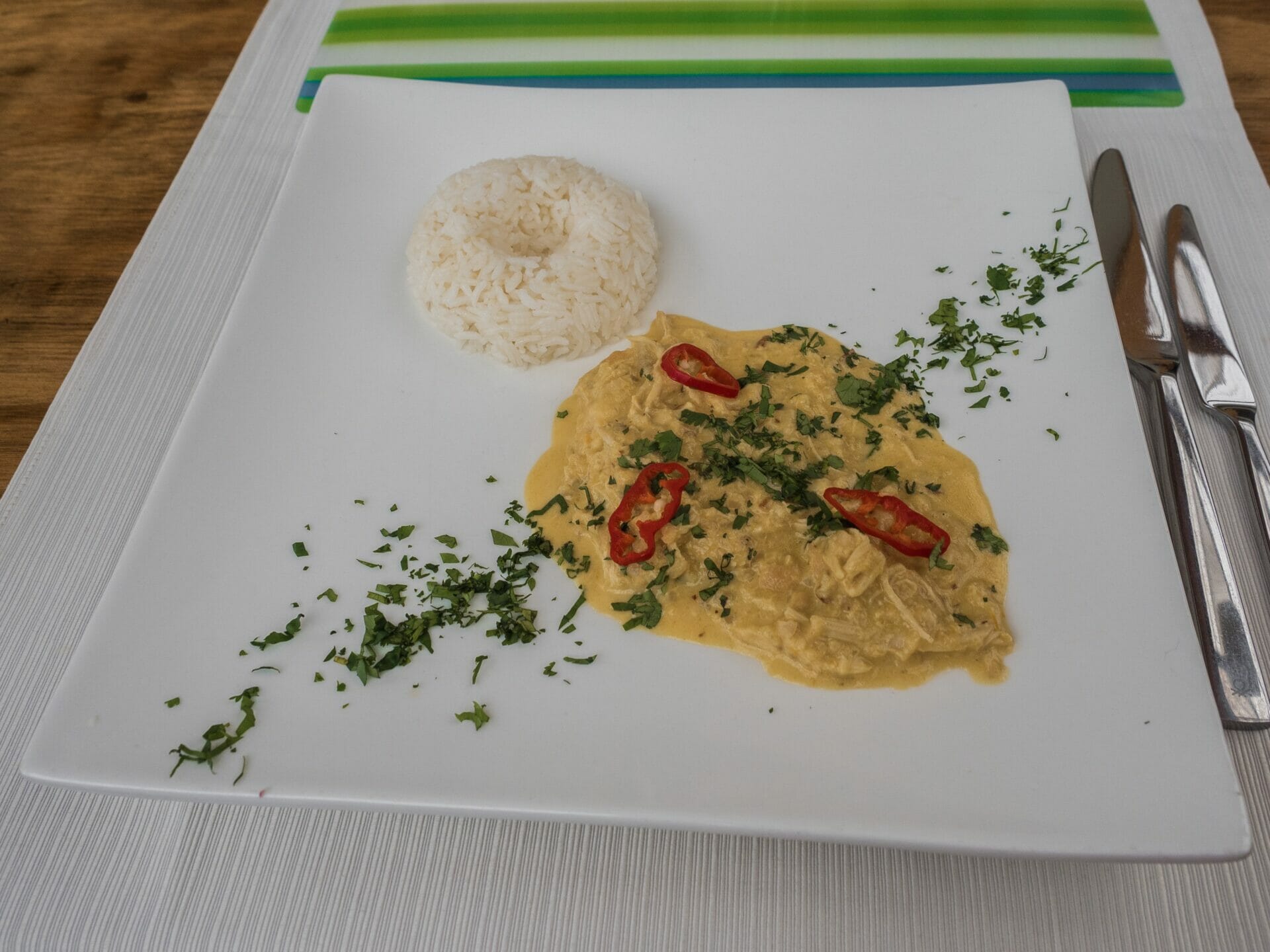 Using a similar chili-based sauce, next we prepare Ají de Gallina. If I thought our Papa a la Huancaína was amazing, I am positively doubled over by the flavours in this saucy pulled-chicken stew laid over a bed of garlic rice.