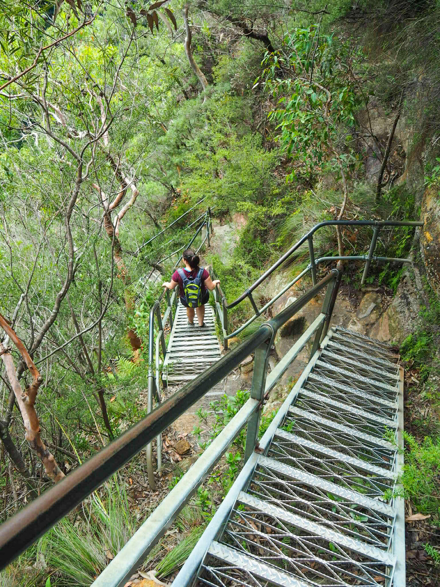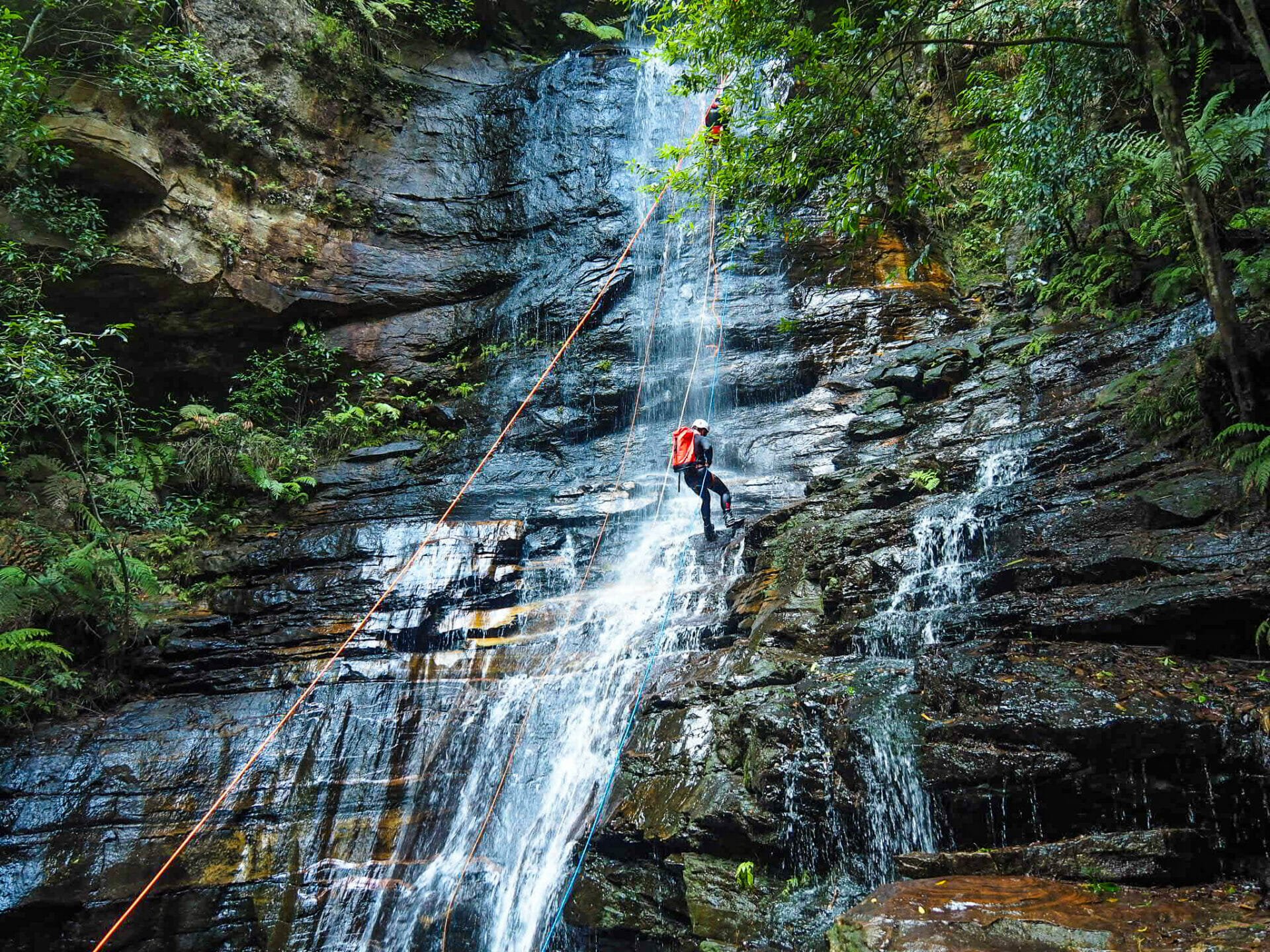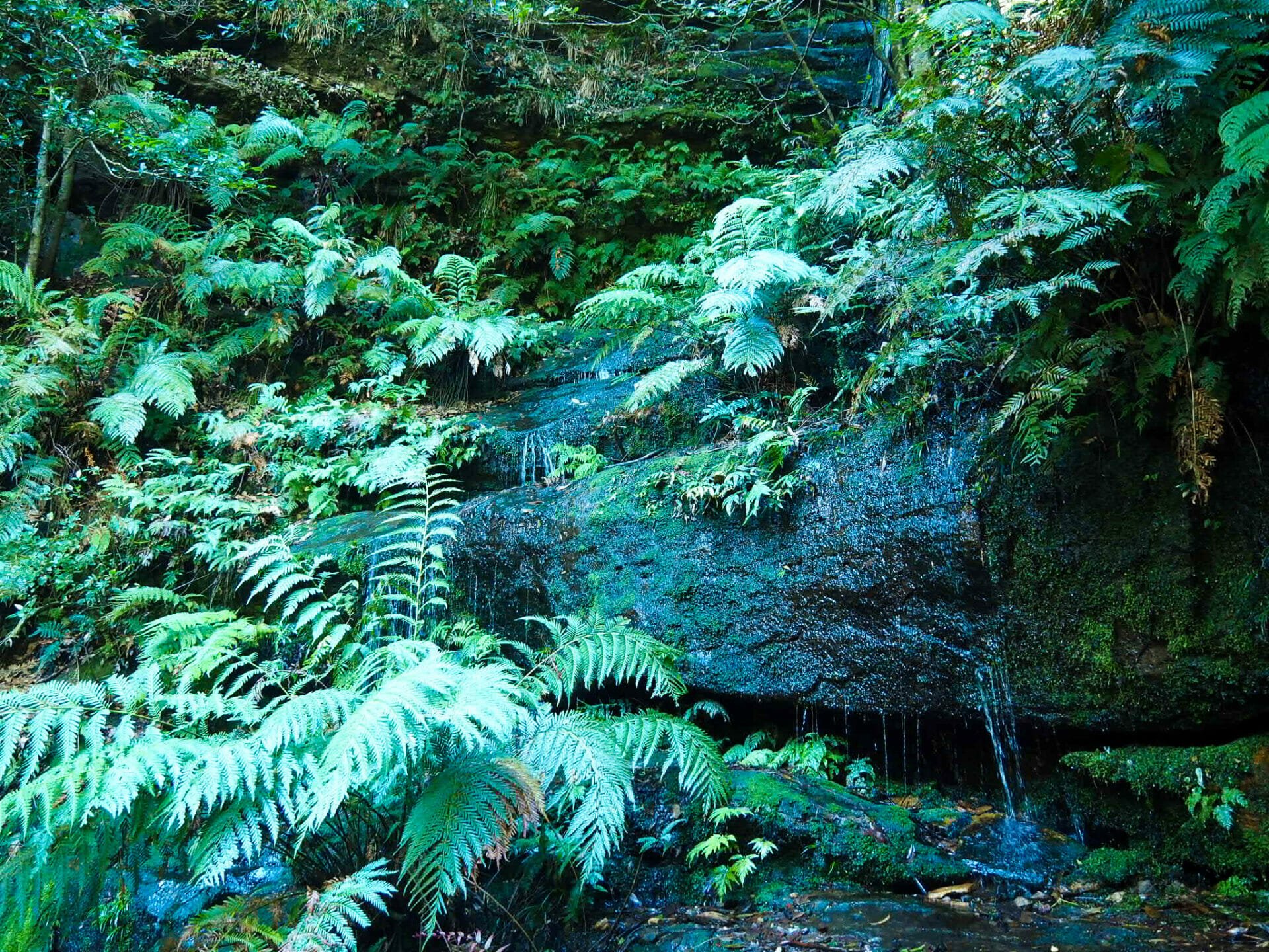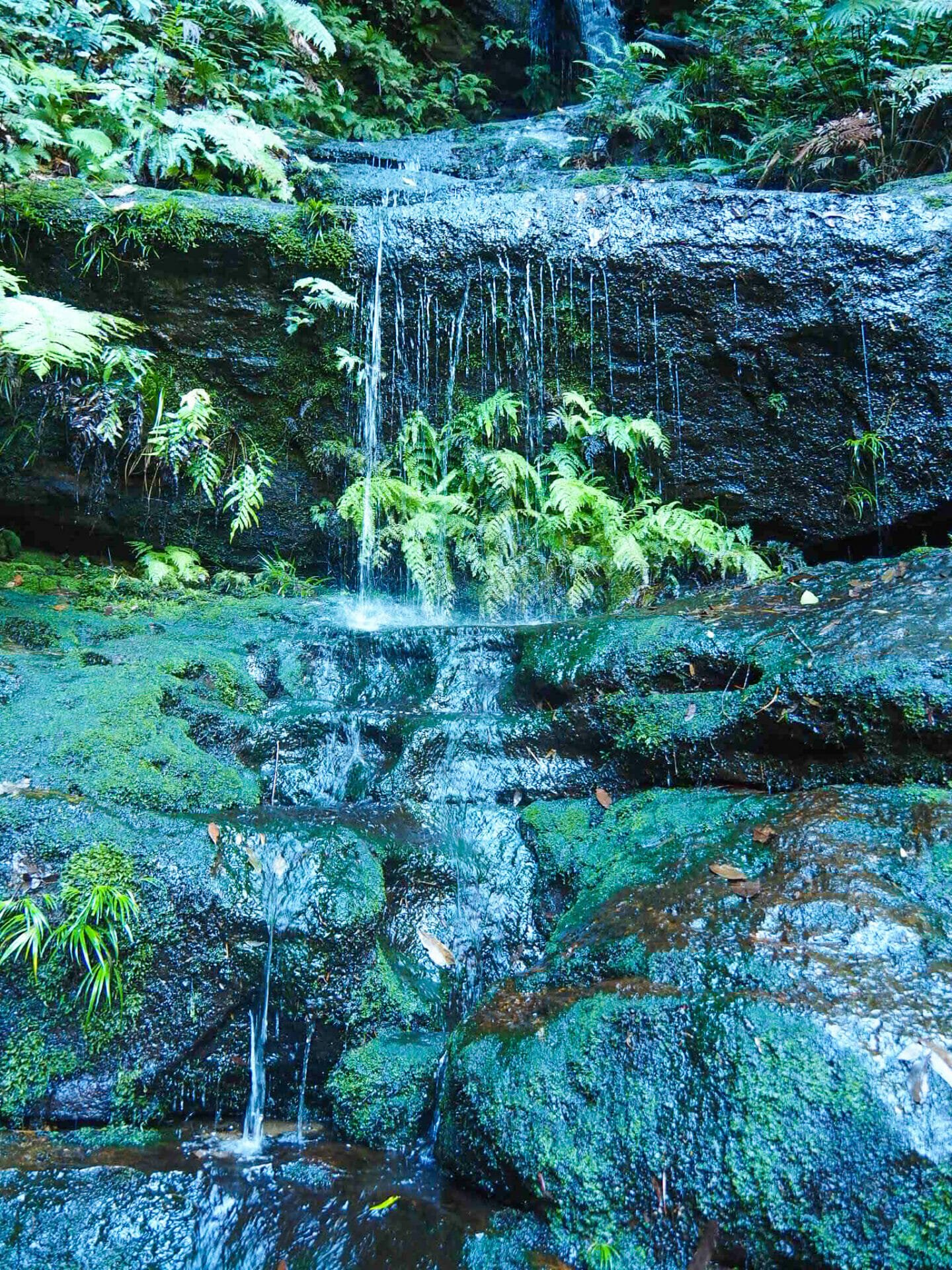 Hopping back onto the main track after Queen Victoria Lookout, the walk continues to descend, eventually reaching a series of metal ladders that have been bolted into the rock to aid in climbing. A number of small cascades appear on the side of the trail; of course, the trade-off for clear weather and dry ground is that there isn’t quite as much water flowing down the rocks, but they are still plenty beautiful. Not long into the ladder descent, Empress Falls is visible below. I was rather disappointed to find a large tour group abseiling down the falls, obstructing our view and also causing quite a bit of commotion, but it was a lovely sight even with the ropes and tourists in the way.