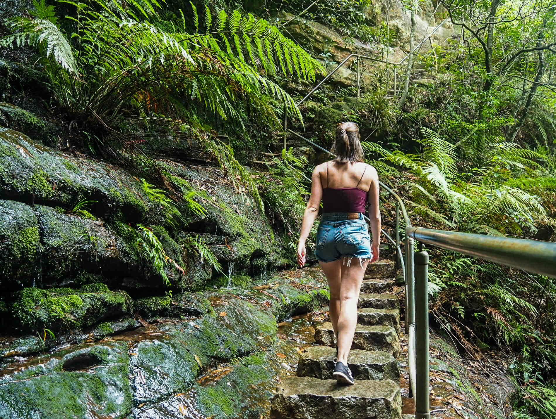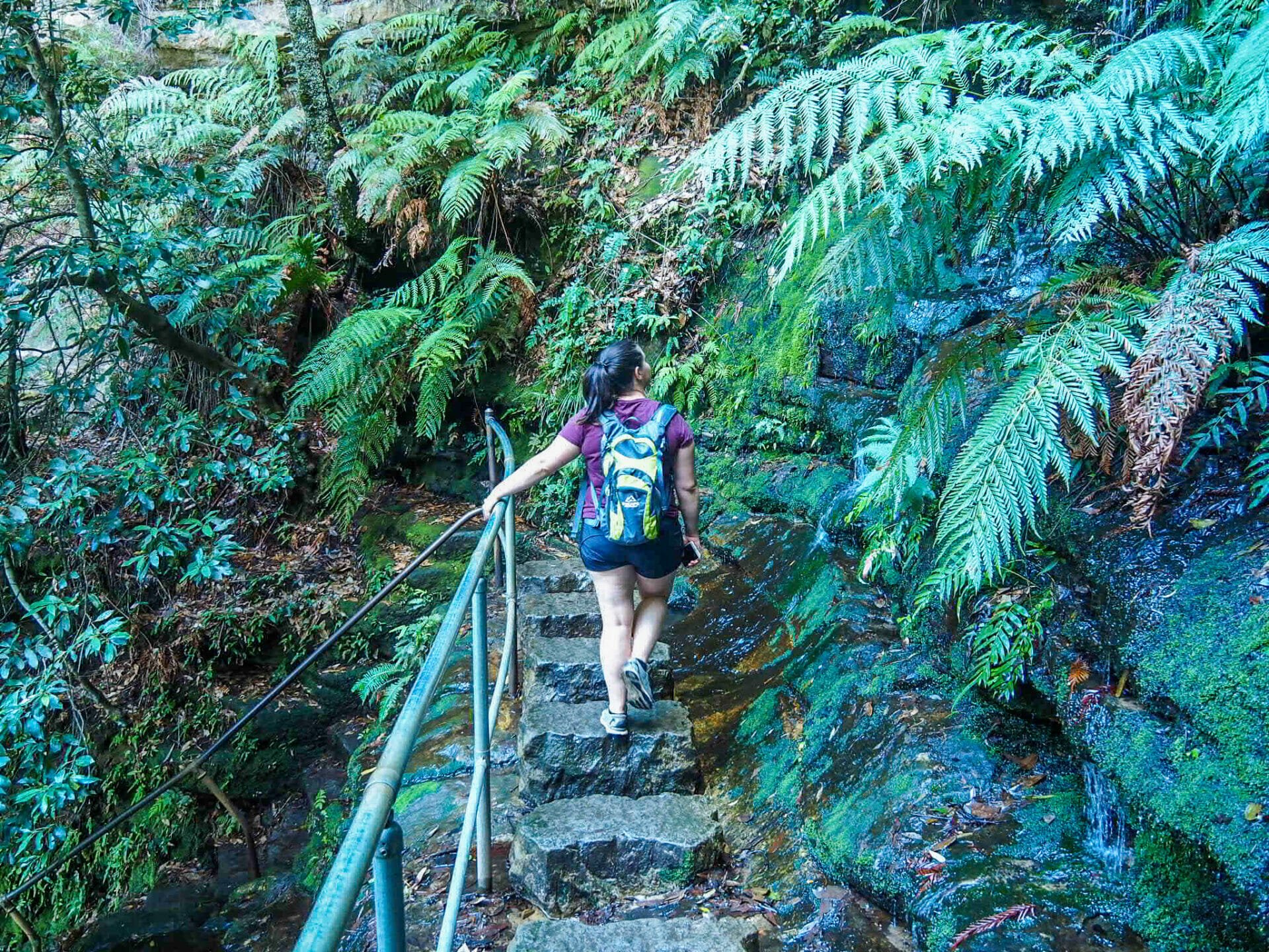 Before long, there is a sign for the Queen Victoria Lookout posted on the left side of the trail. Follow the path down just a few more steps to reach this fenced-off point, which offers simply wonderful views over the Blue Mountains and their characteristically orange cliffs, lush eucalyptus forests, and strangely Jurassic Park-esque palms. Often, these viewpoints that require a little effort to reach are nearly empty compared to the more accessible and well-known lookouts (Echo Point), so it’s possible to enjoy the scenery all to yourself before continuing on further into the valley.