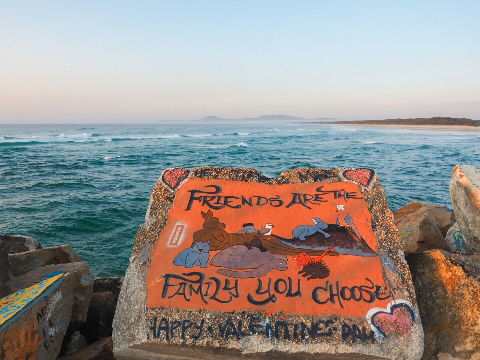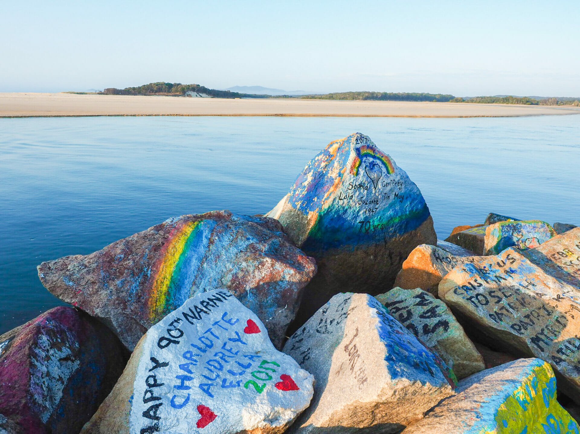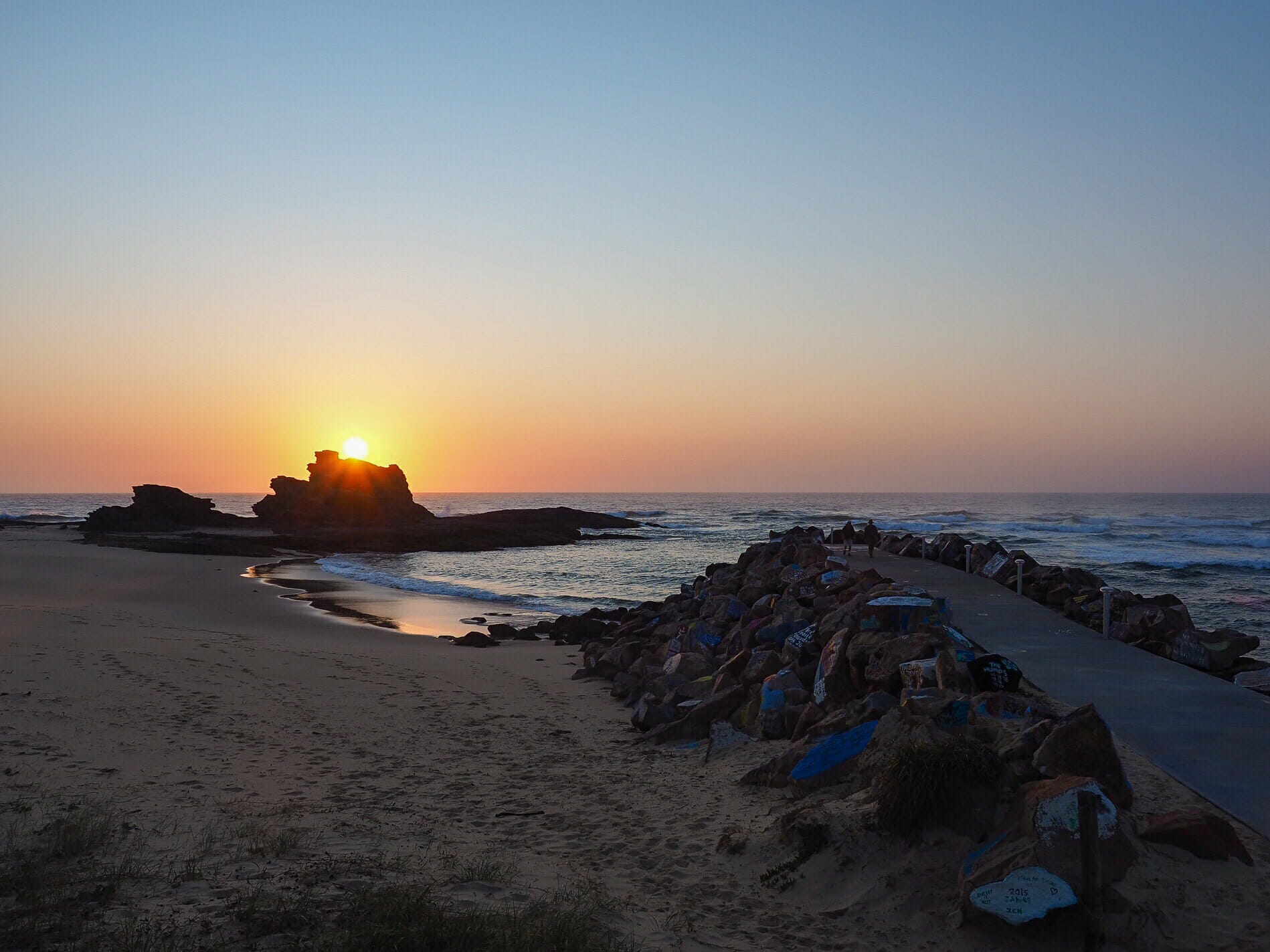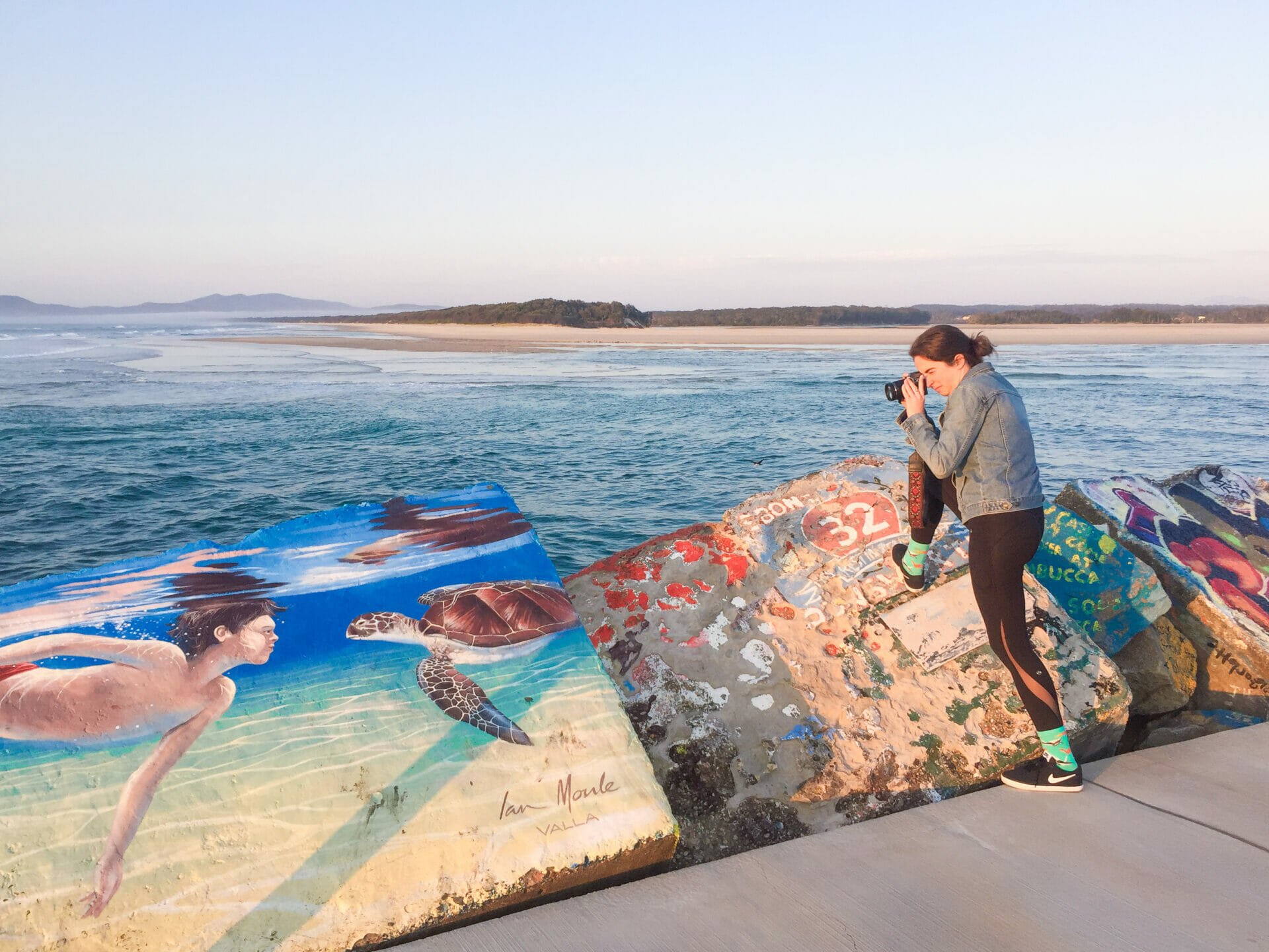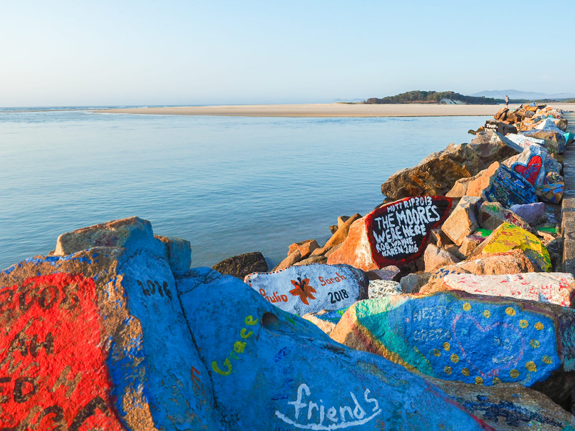 The Foreshore Walk, which came highly recommended by Diana’s boyfriend who holidays here annually with his family, winds all along the Nambucca River, alternating between a footpath and an over-the-water boardwalk that eventually brings us to the colourfully painted breakwall. We get distracted by some particularly artistic rocks before realising that the sun is well and truly on its way up now. Not wanting to miss a single moment, we sprint the final distance along the breakwall, reaching Pilot Lookout just in time to watch the light break over the rocks.