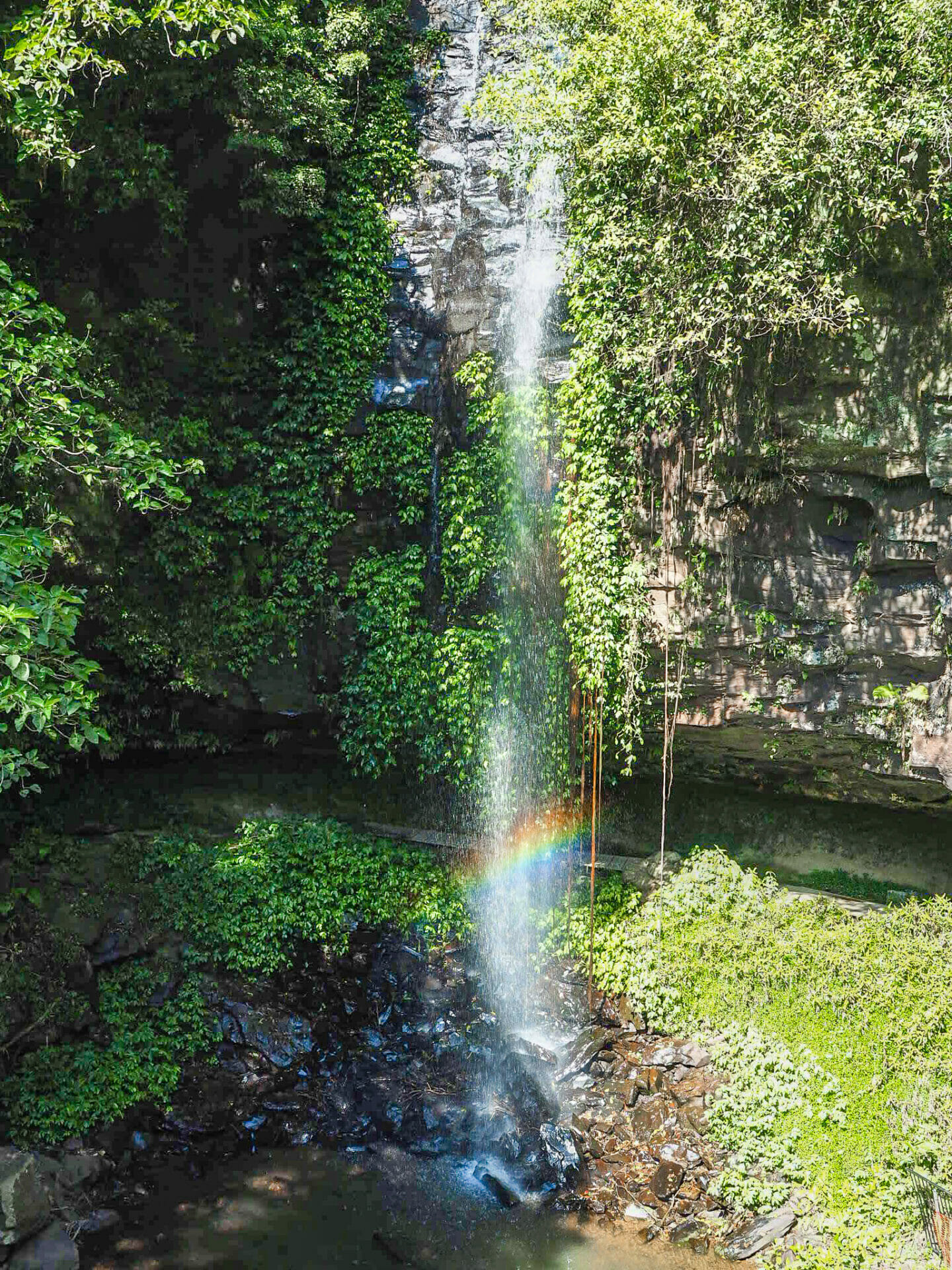 We only have to drive 2min down the road to reach The Glade picnic area where our rainforest walk begins along the Satinbird Stroll, a gently declining section of trail that enjoys almost full shade from the towering trees. I spend the majority of this section tailing a goana as it weaves through the bushes, trying (in vain) to get a nice photo of the enormous lizard. Soon, our path joins up with the longer Wonga Walk and we continue along this trail for another 15min to reach Crystal Shower Falls. There’s distinctly less water falling than we saw at Dangar Falls, but the early morning light has created a rainbow along the bottom of the waterfall that makes for an absolutely magical scene. After taking several dozen photos from the suspension bridge, we start back upwards to the car, finishing our 3.7km hike just under the self-imposed 1hr deadline.