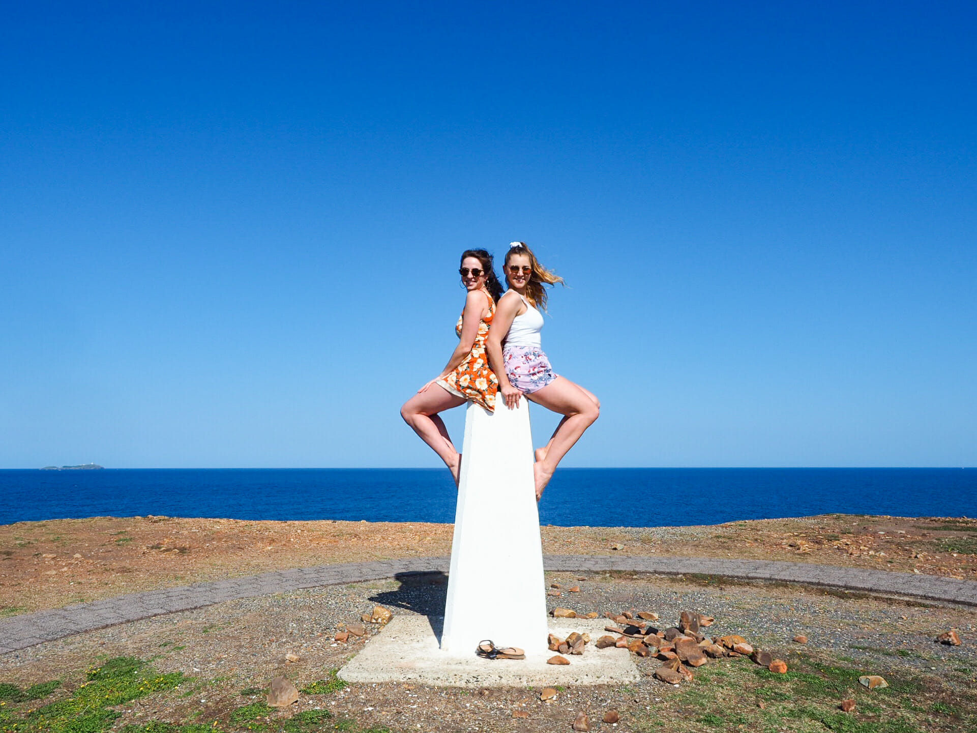 In reality, we see about 40 small grey dots milling about on the hillside before we’ve even parked the car and then about a dozen roos nibbling on grass or lounging along the path as we half walk/half run across Emerald Beach towards the headland, giggling somewhat hysterically. It’s not long before we’ve crossed the sand, climbed the steps, and made our way along the path to the lookout, where we can see superb beach views around either side of the headland. Somewhat overwhelmed by having incredible scenery AND kangaroos in a single location (I’m used to seeing roos in grassy fields or on the side of the road, certainly not at beautiful beaches), we snap quite a few photos of the view, struggling to both sit atop the white pillar for the perfect #BiomechanistsOnTour photo, before continuing our walk.