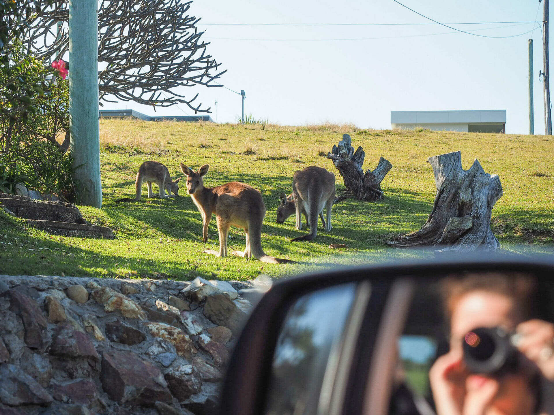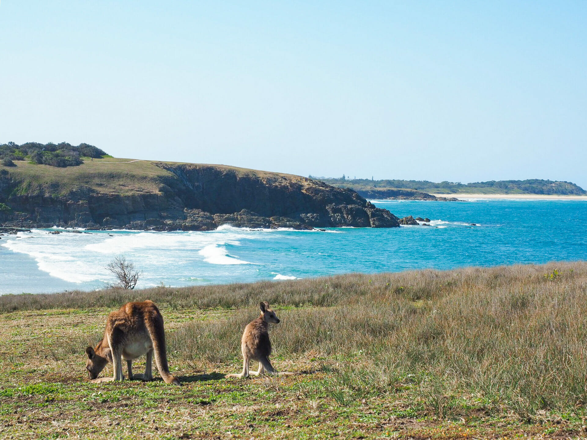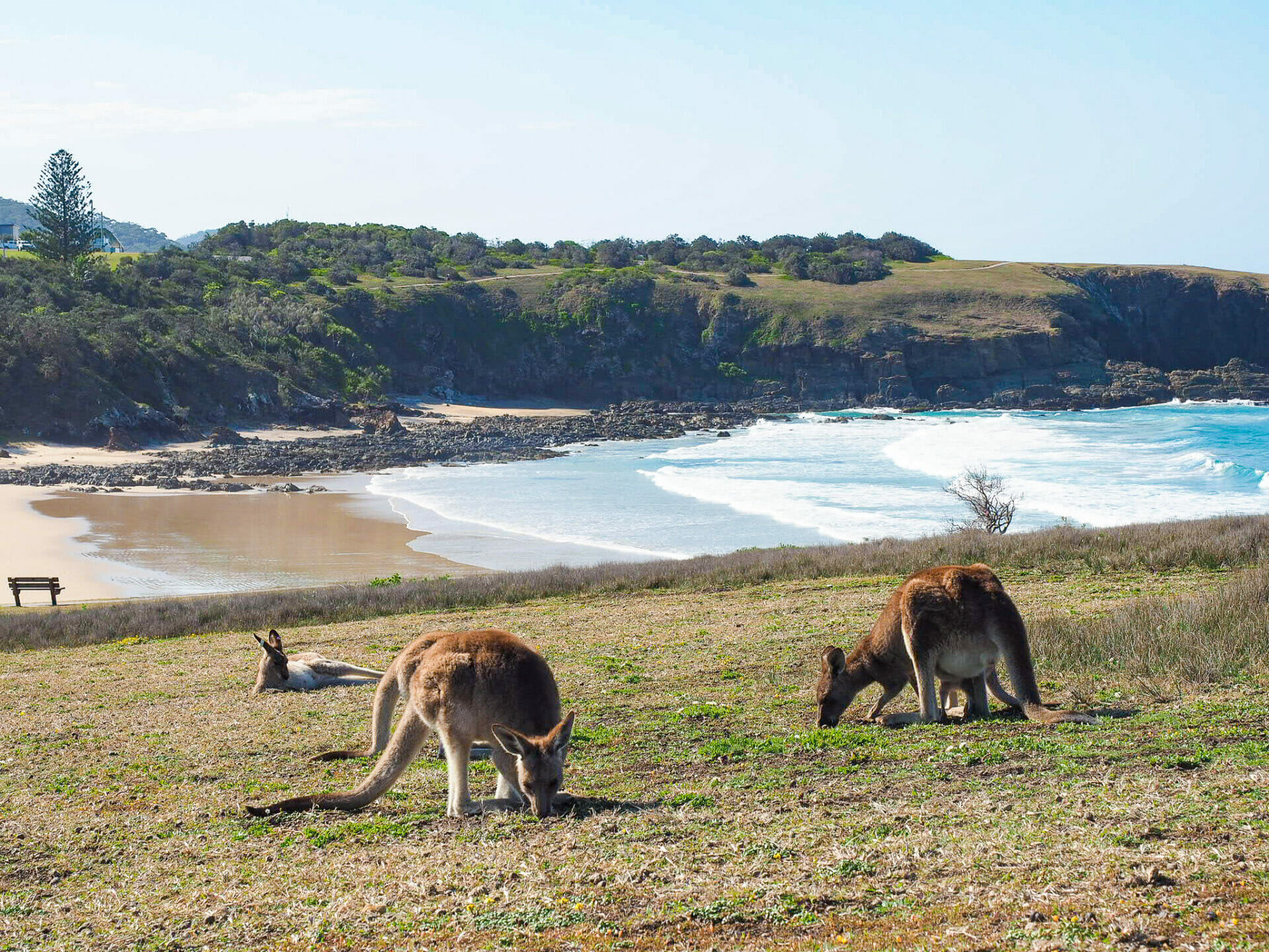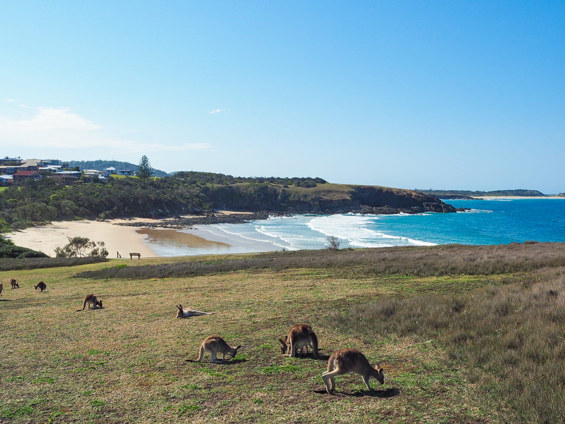 Just 20min north of Coffs Harbour, our final stop of the day is Look At Me Now Headland, a superbly named hill that I read about as a great place to see dozens of wild kangaroos just hanging out around the beach (and I think we can all agree that’s pretty adorable). I’ve been trying to moderate my excitement all day, reminding both myself and Diana that there is no guarantee when it comes to wild animals and that even if we don’t get to see any roos, at least it’s still likely to be a nice beach.