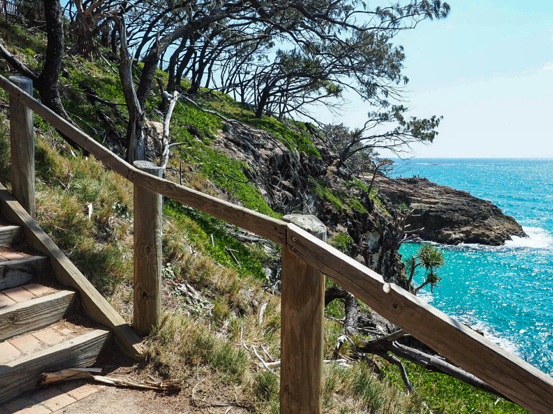Just as we are nearing the end of the walk, the wind that’s been lightly blowing all day approaches gail force, rattling the screw palms and threatening to topple us right over the edge of the cliffs. It’s definitely not ideal weather for spotting aquatic life, but it’s the large grey cloud looming in the distance that really encourages us to stop for lunch in Point Lookout rather than catching the bus to nearby Cylinder Beach. We are pretty pleased with our timing to have gotten blue skies for our entire North Gorge Walk, but still, we hope that the new cloud cover will quickly burn off so we can return to drooling over the scenery as soon as possible.