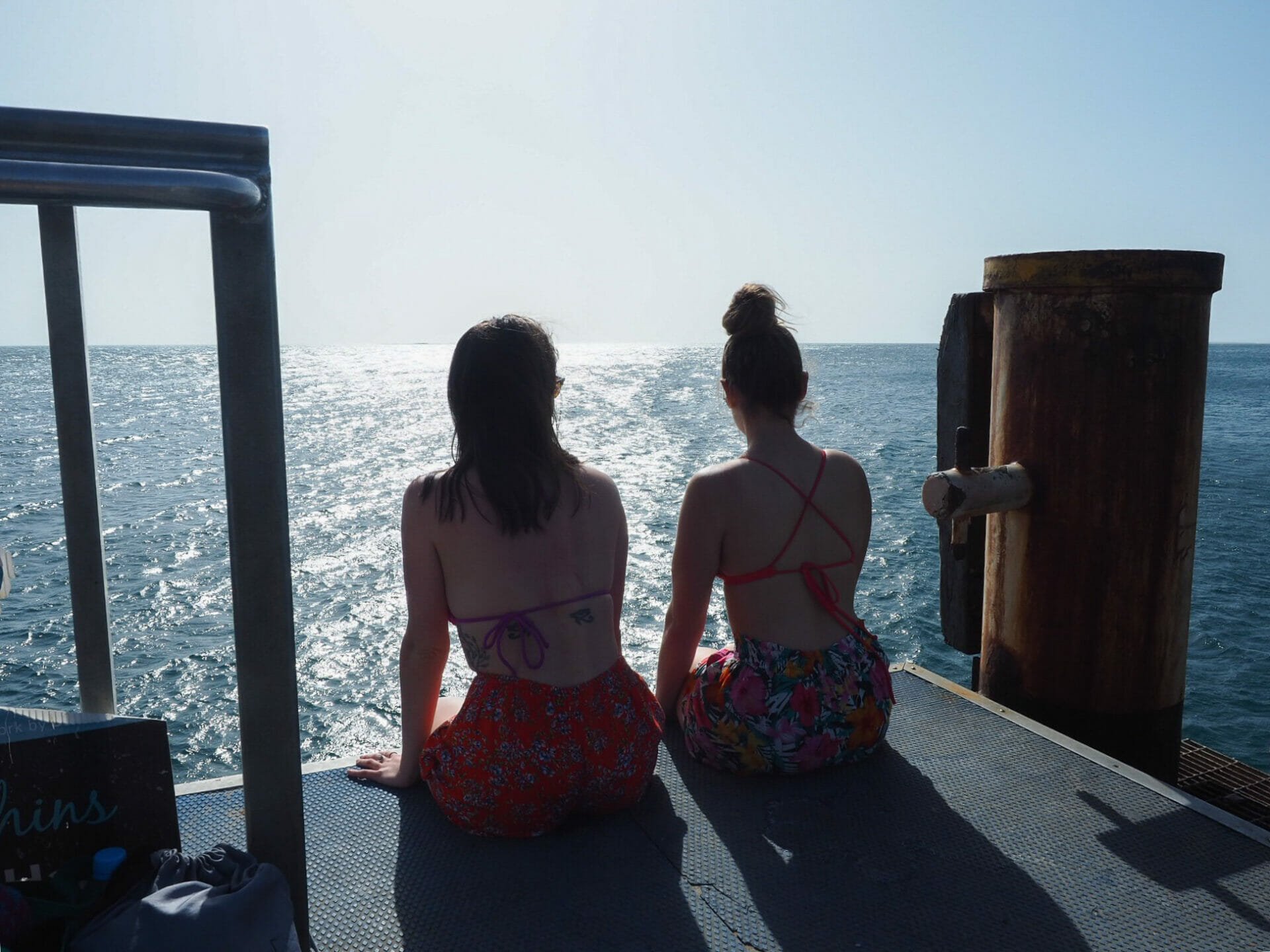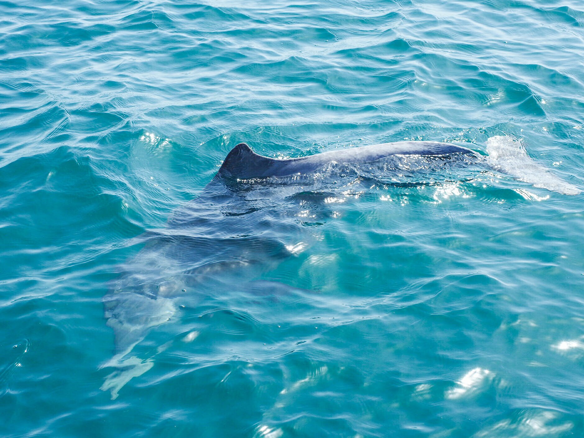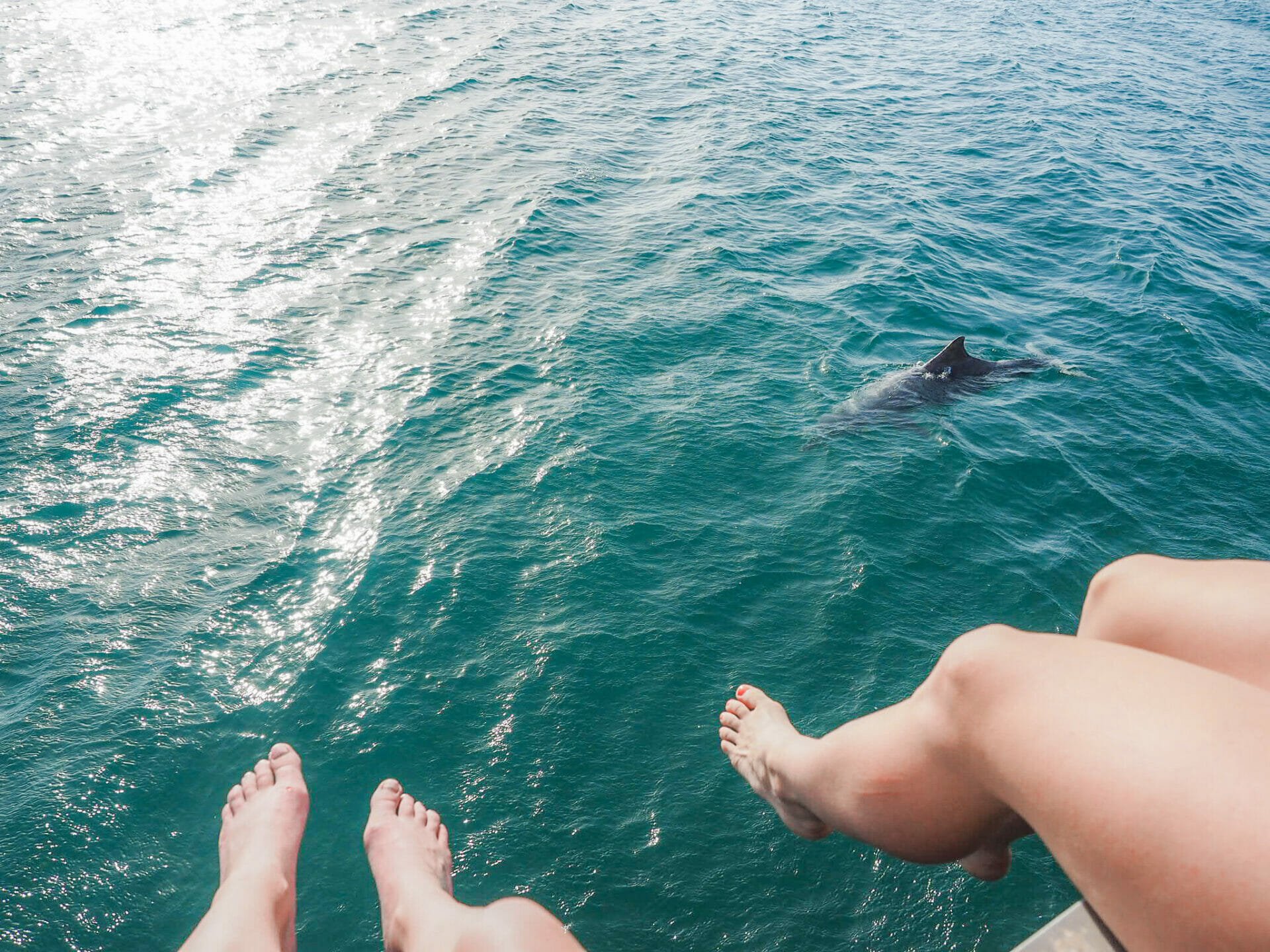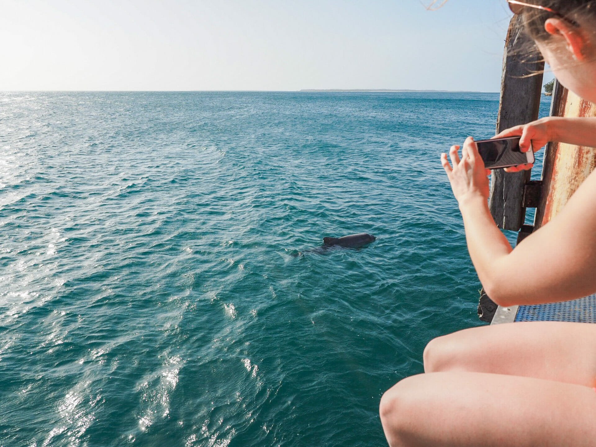 Disembarking from the minibus, Diana and I head immediately to the jetty to look out for dolphins, but we don’t even make it to the end of the short walkway before we see a few sleek, silver bodies darting around. I’m absolutely amazed by how close the dolphins will swim to our legs as we dangle excitedly over the edge; apparently as interested in us as we are in them, they swim laps around the jetty, returning again and again to splash around right in front of us and the solitary fisherman to our left.