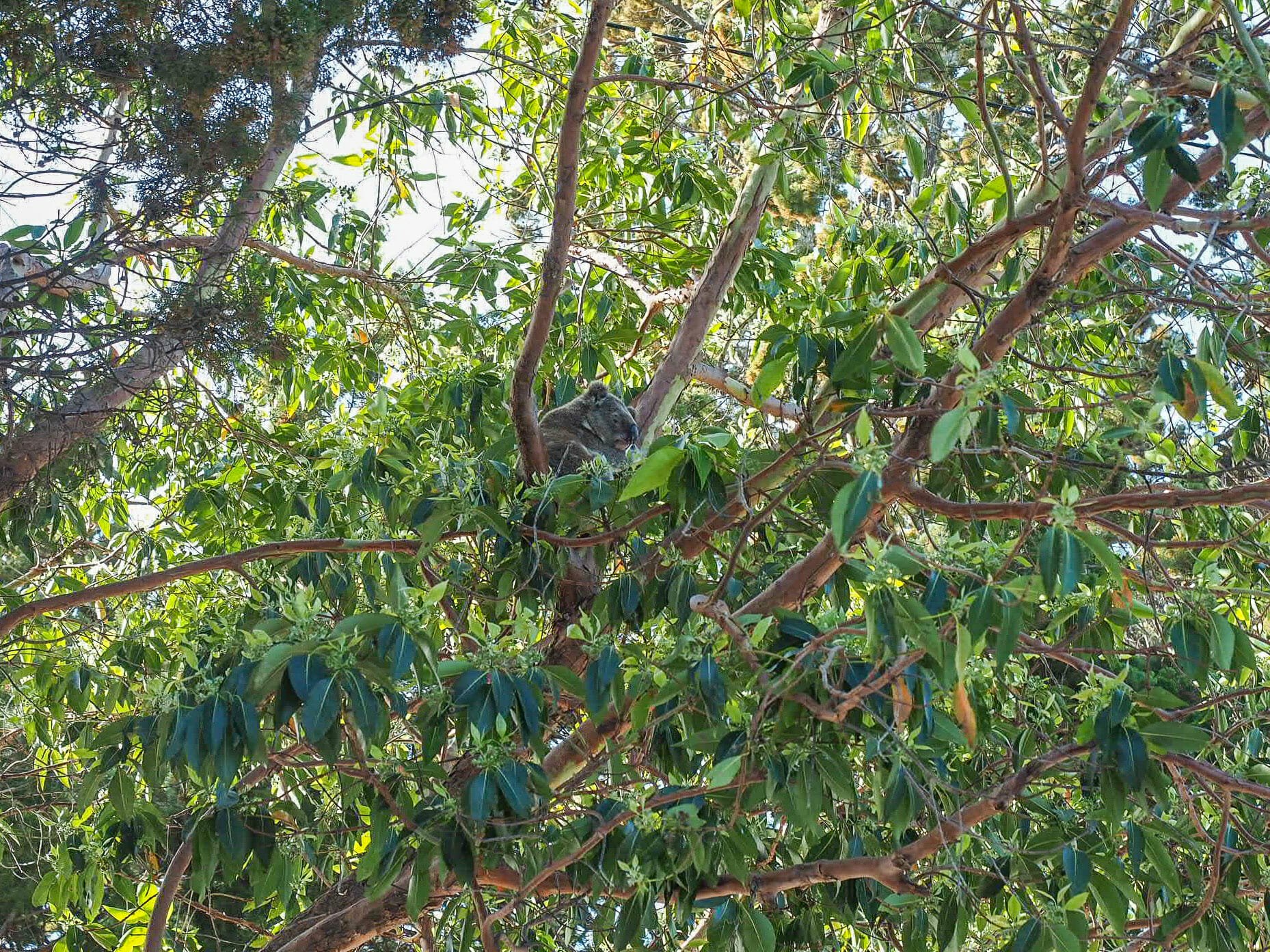 - Koala camouflaged in the trees above