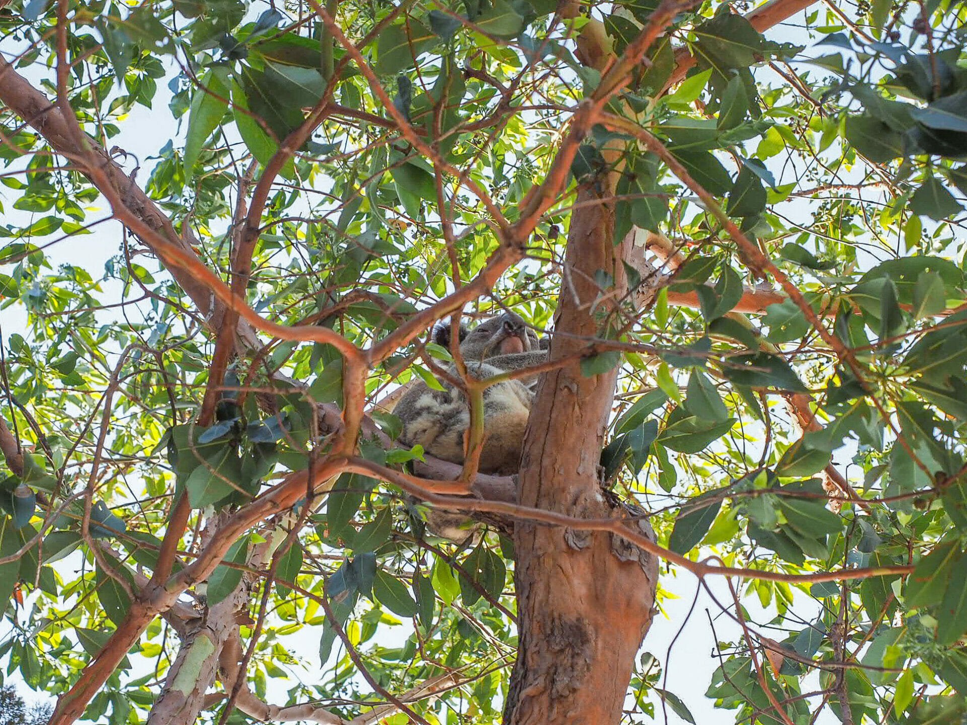 After some time in the water, Diana and I wander slowly back towards the jetty, scanning the trees for any grey lumps as we go, hoping that a snoozing koala will be just above us. Unfortunately, we make it all the way to the jetty without seeing any marsupials, but the pod of dolphins playing just in front of us more than makes up for it. Without even paying attention to the time, nearly two hours go by as we sit and enjoy the views, watching the dolphins perform at our feet and occasionally getting up to run frantically to the other side of the dock for a video of our new bottle-nosed friends (see video above). By the time we do check our watches, we have to head back for the bus, but we are absolutely glowing with happiness over what we’ve just seen. And, as if today could get any better, Diana finally finds a wild koala for us just 50m from the bus stop, hanging out in a mid-level branches of a gum tree on the side of the road.
