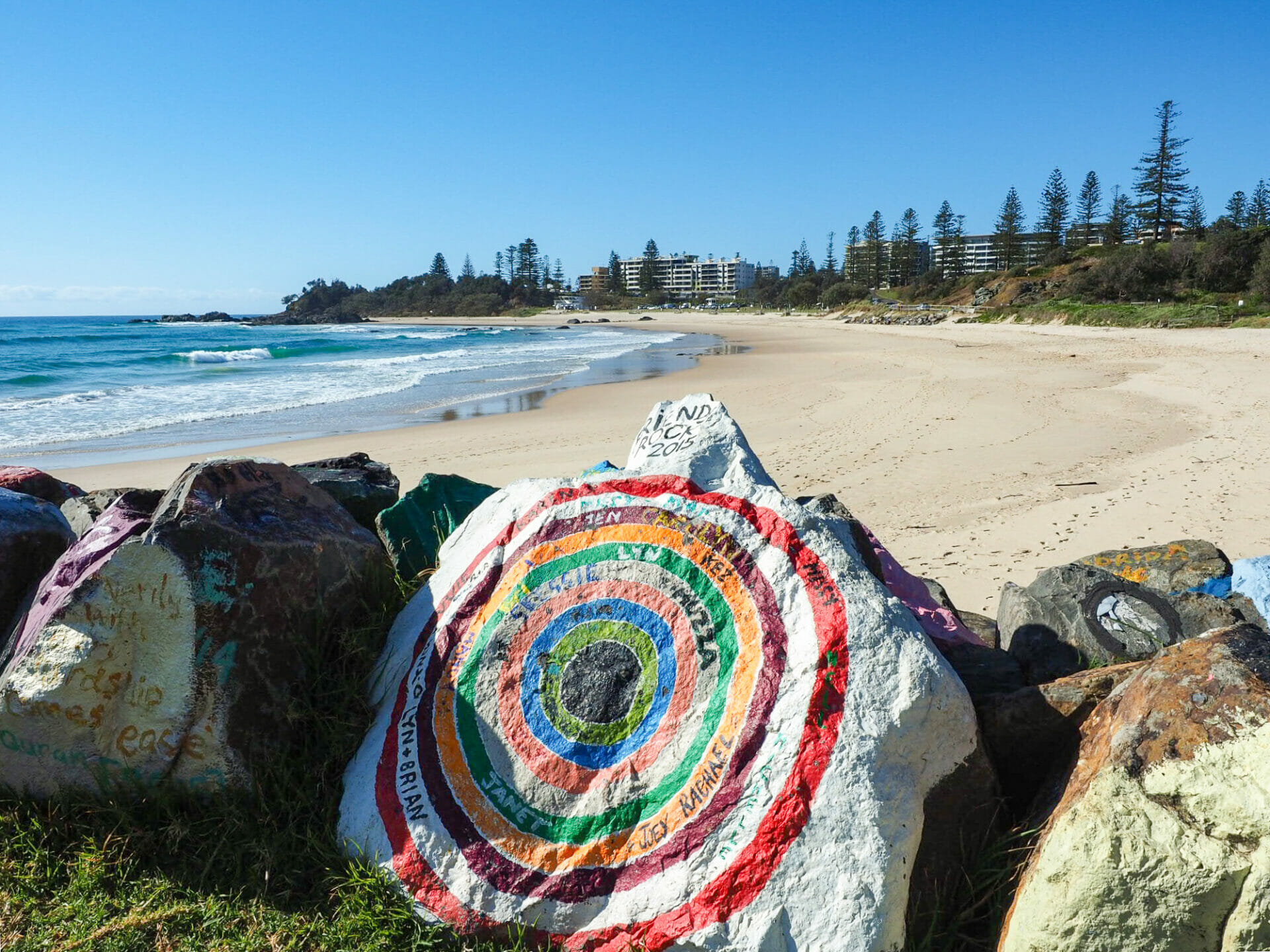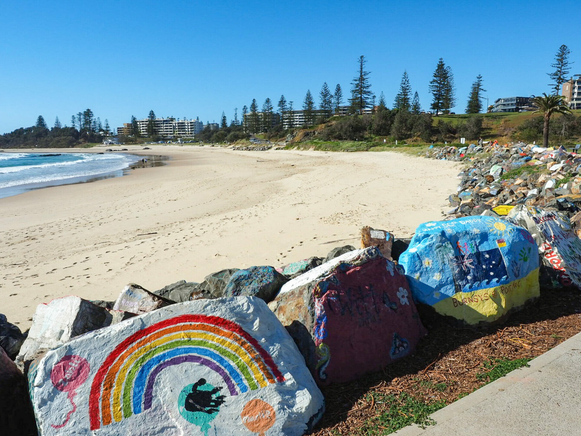 While Diana heads off to get a coffee from a nearby cafe, I scamper down to Town Beach to check out the colourfully painted breakwall, much like the one we loved so much in Nambucca Heads. Impressive from our hotel room window, it is even more spectacular up close, providing vivid personality to the lovely beach. Although Port Mac is a popular family holiday destination in the summer months, it feels like I have the coastline almost entirely to myself this Tuesday morning in September, which definitely adds to the feeling of serenity.