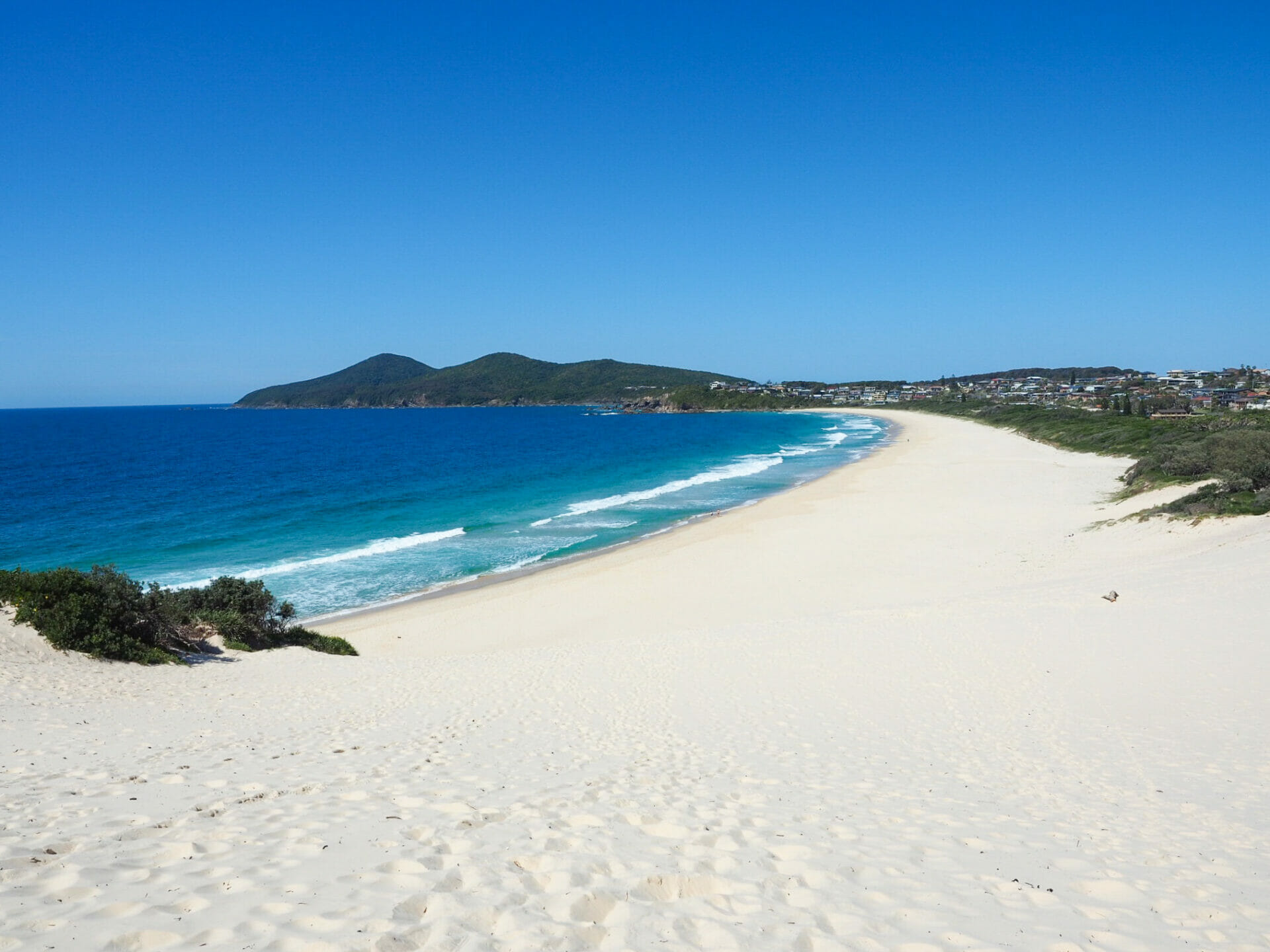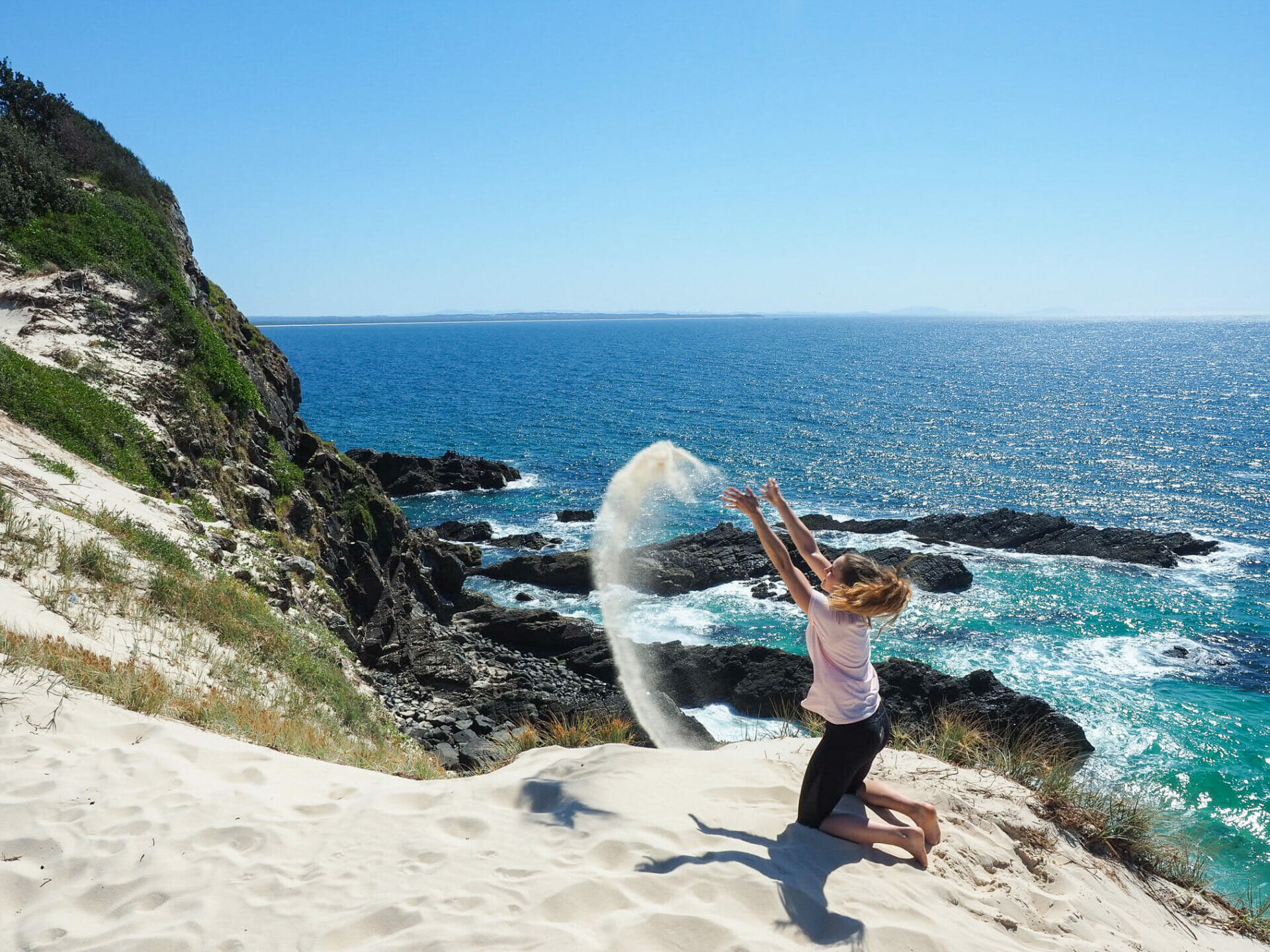 Just when we think One Mile Beach couldn’t get any better, Eagle-Eye Diana (a well-earned nickname) spots a family of humpbacks immediately off the coast, so close to the shore that I wonder how they are navigating around the rocks. We follow the whales for a few minutes before another family appears at the front of the headland, and then finally see a mum and two babies swimming through the bay, splashing and playing as they make their way south. Awe-struck and screaming at a volume usually reserved for bungy jumping or murder, we watch as the mum breaches and her two babies follow suit, as if she’s showing them how to jump and they’re having a go themselves. I don’t capture anything more than a measly splash on camera, but it’s truly one of the most amazing things I’ve ever seen and I can’t even describe the excitement of experiencing such a natural yet unbelievable performance from our sand mound at the beach.