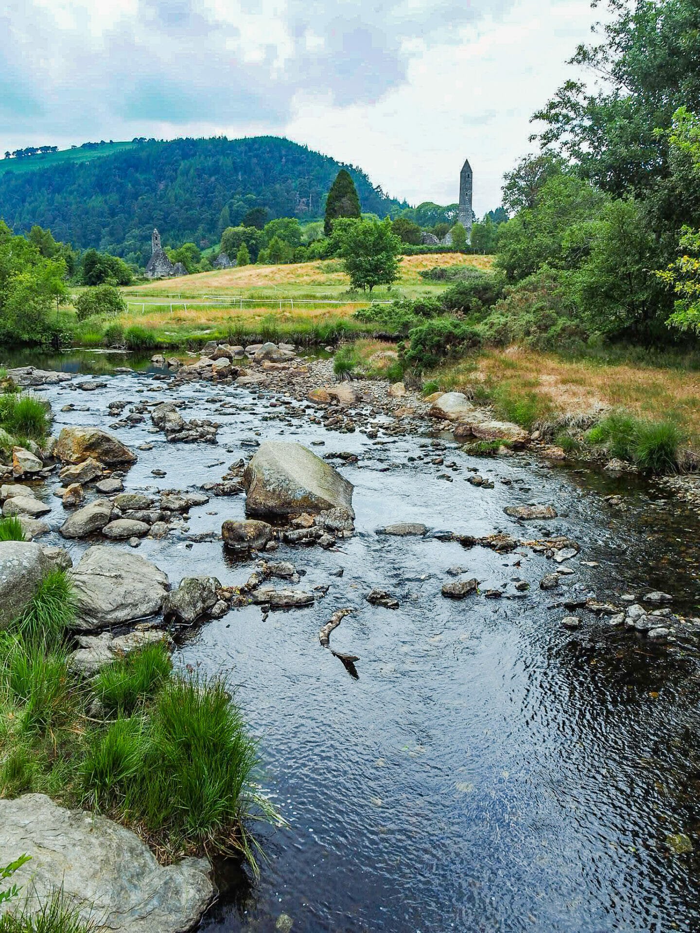 A riverfront view of Glendalough’s Round Tower