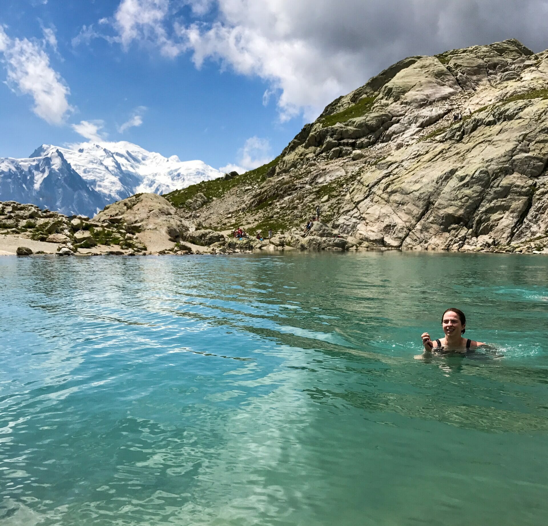 Highlights: The famed ladder section with vertical climbing, stunning alpine lakes, swimming in freezing cold Lac Blanc, descent from the mountain into Chamonix for the end of the hike!
