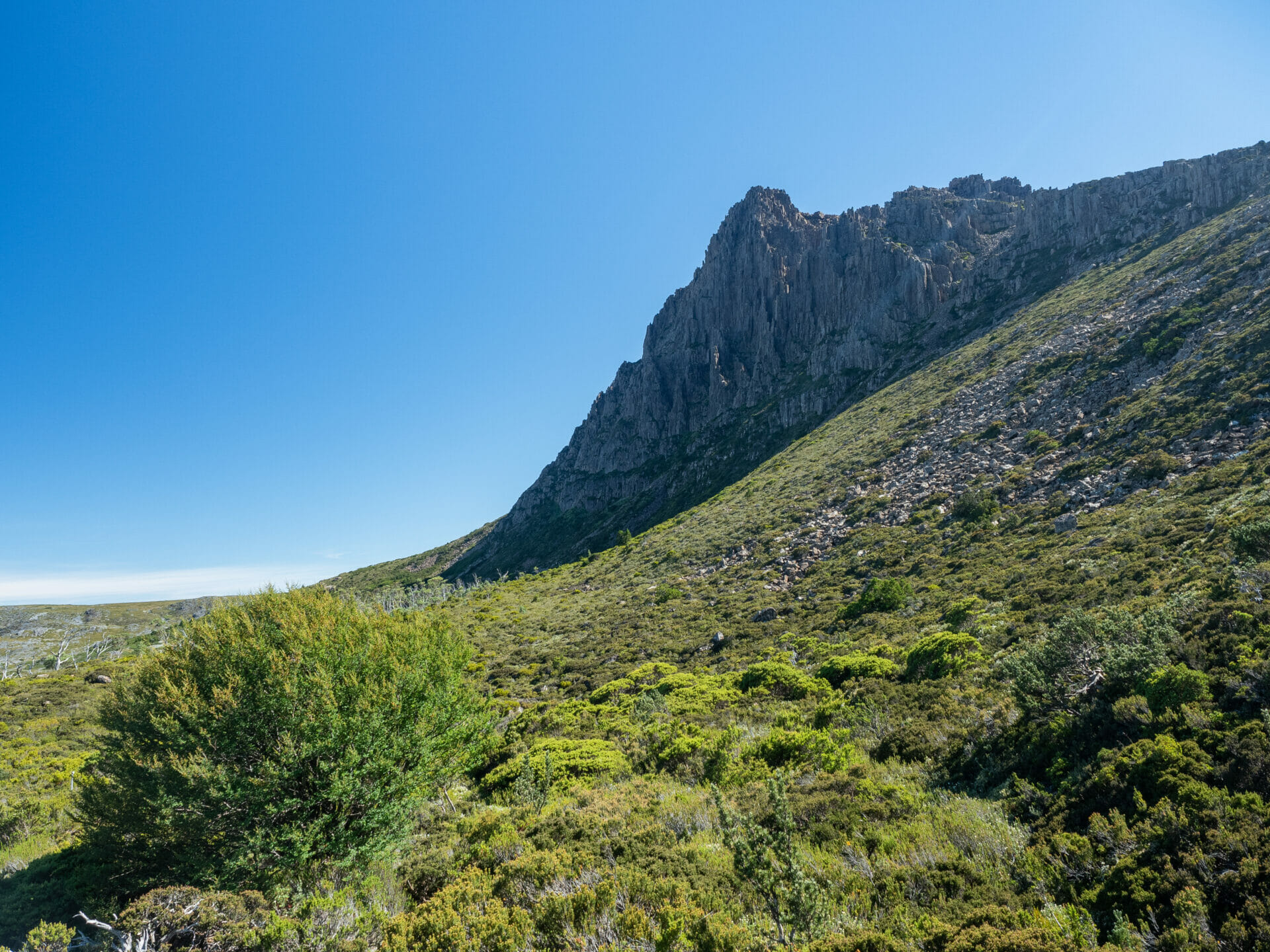 Amazingly, I wake up in my snug sleeping bag this morning to an ankle with very minimal swelling. Despite the worst of my fears, it doesn’t appear to have worsened at all since the sprain yesterday afternoon, and I am ecstatic that this means I can continue onwards, even if it does mean walking a bit slower than usual and skipping the side trip to Barn Bluff this morning. Dad and Eileen are already packing by the time I poke my head out of the tent, our campsite enjoying prolonged morning shade thanks to the surrounding hills, and they set off towards the summit after making plans to rendezvous with us at Waterfall Valley Hut around lunchtime.