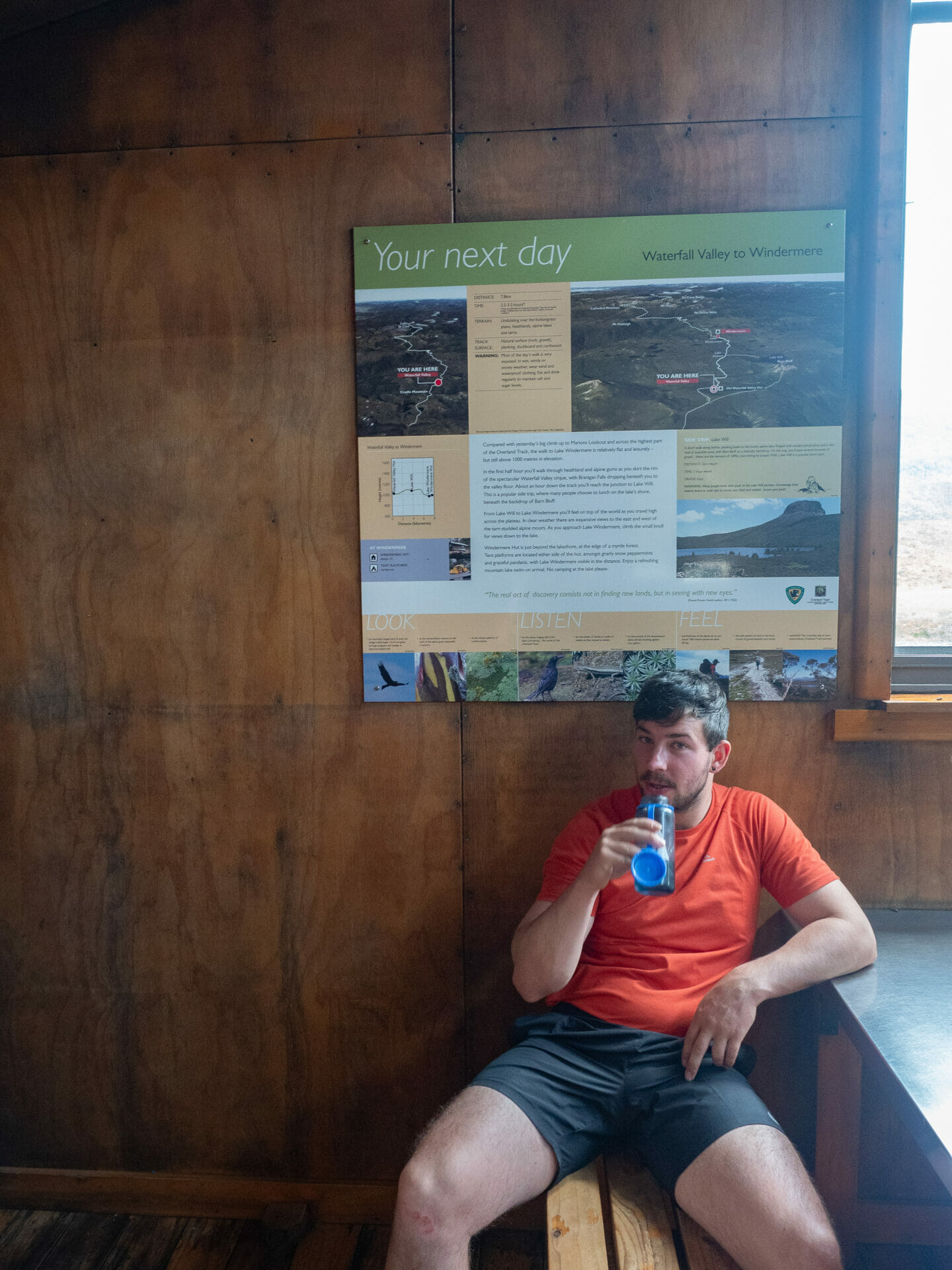 Upon our arrival at Waterfall Valley, after what feels like a lifetime of shuffling along the trail, we are greeted by the hut warden, who expresses concern at not having seen us last night. As a safety measure, all the Overland Track hikers who departed on the 15th have been tagged with numbers 1-34 and apparently each hut warden tries to touch base with groups as they arrive in the evening. My ankle sprain may have been a fair excuse for having wild camped near the base of Cradle Mountain rather than carrying on into the valley last night, but the warden strongly encourages us to continue to the next hut tonight rather than stopping short at Lake Will. In his own words, “if you can make it to the lake, you can make it to the hut”.