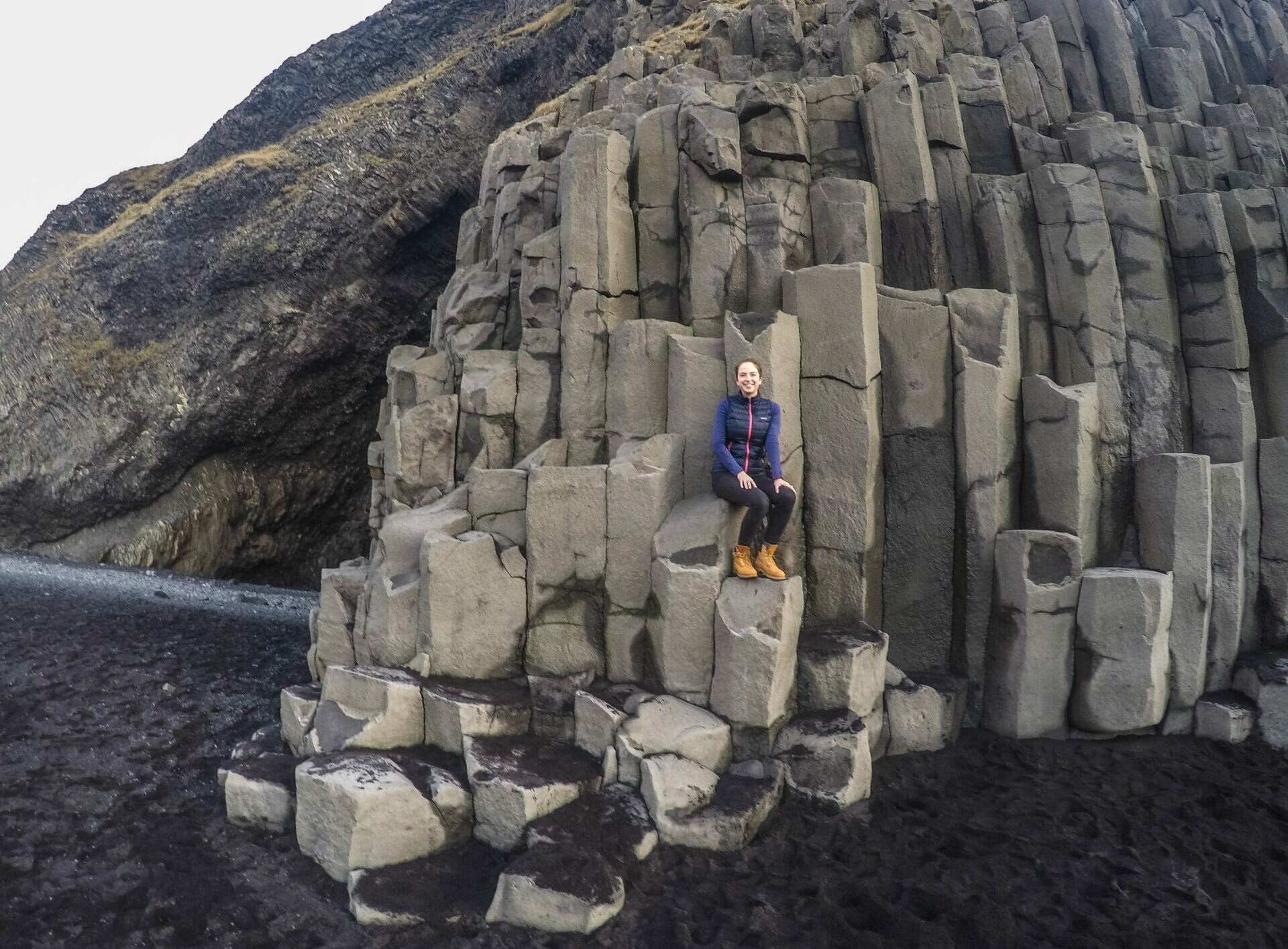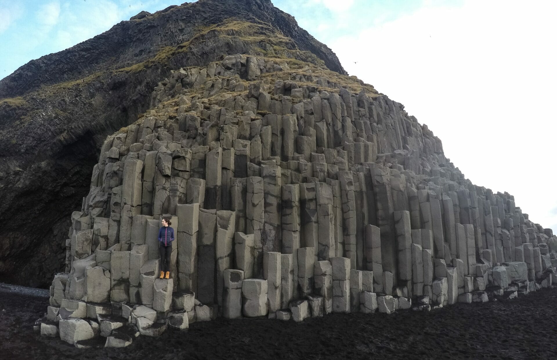 On the way, we stop at Reynisfjara beach, which is a black sand beach in Vík with more unusual geology! Rugged sea stacks in the ocean, called Gardar, protrude upward and a huge mountain has formed on the shore out of hexagonal basalt columns similar (but much larger) than the ones we saw framing the waterfall Svartifoss in the east.