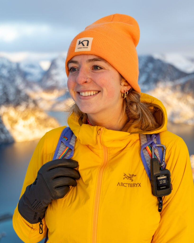 While it isn’t fully waterproof, it offers enough weather resistance for light snow and wind (and layers perfectly under a hard shell when conditions worsen). James and I both used this jacket on EVERY hike in Lofoten, and it’s also the jacket I use more than any other for mountain adventures around the world!