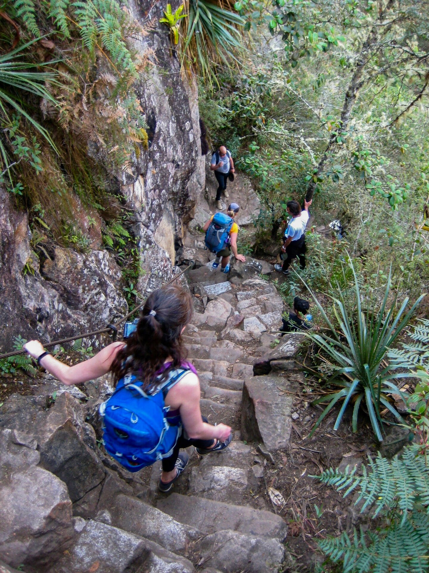 Exactly at 5am, guards begin shuffling people through, checking our passports and Machu Picchu tickets to make sure we all have 6am entrance to the ruins. There are only a few people in front of us, so we are through the gate in a matter of seconds, leaving us with an hour to climb the 1,800 steps to Machu Picchu and meet up with everyone else at the main entrance gate.