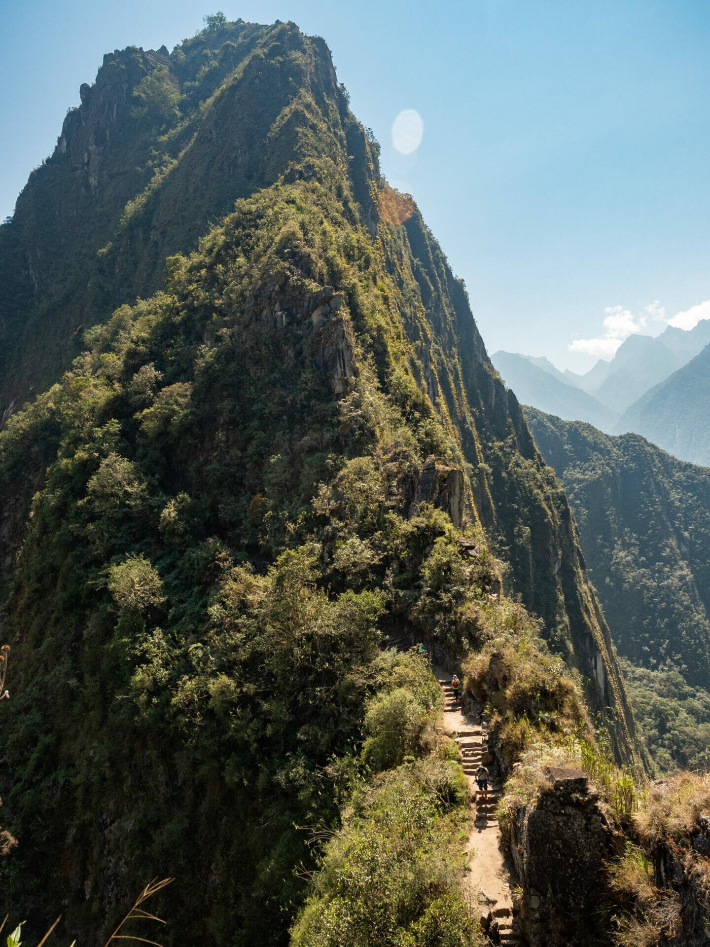Dad and Eileen climbing Huayna Picchu with Machu Picchu in the background