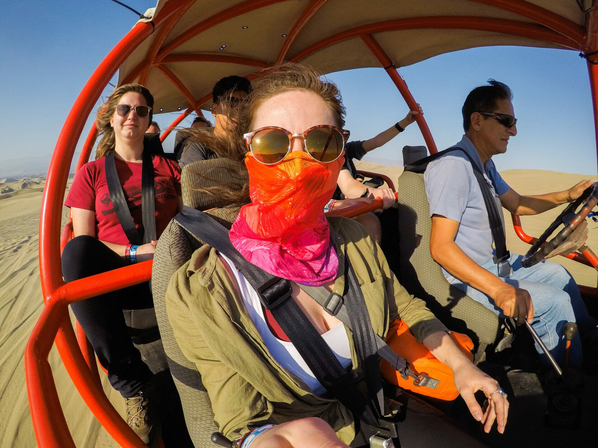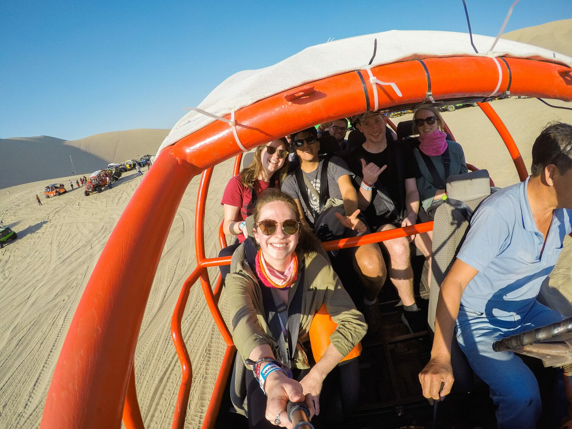 Thankfully, I make it to the meeting spot just in time to rendezvous with my friends before we are divided into buggies. Attentive guides that they are, the Peru Hop staff who are travelling with us have already sorted most of our little group into one vehicle, so we walk a short distance up the sand and then strap ourselves in for what’s been promised to be a wild ride.