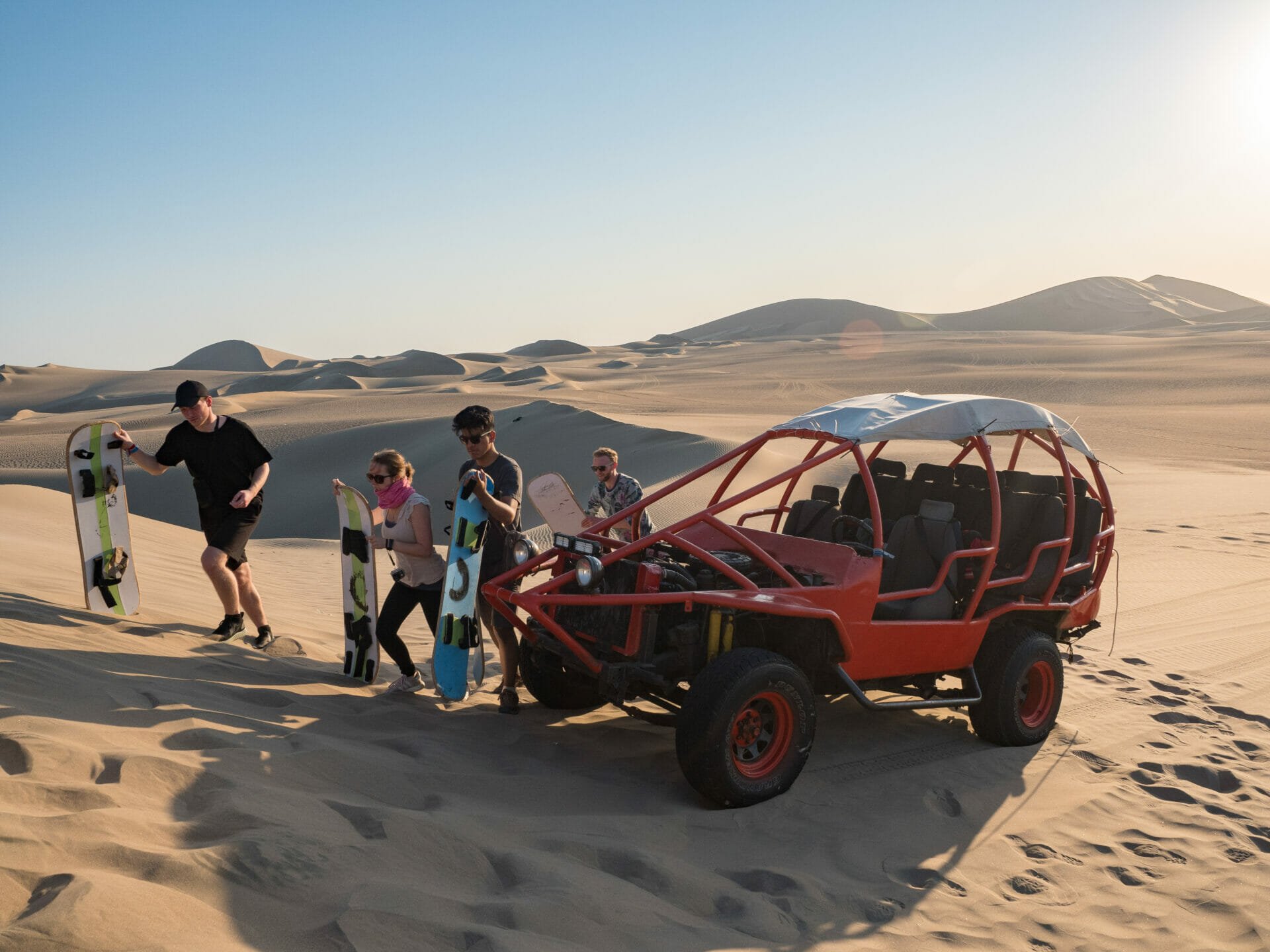 Our dune buggy is actually just a modified car, and judging by the sounds it’s making as we climb increasingly larger mounds of sand, an absolute relic. Still, we are all laughing and taking videos as we fly through the dunes out towards our first sandboarding hill.