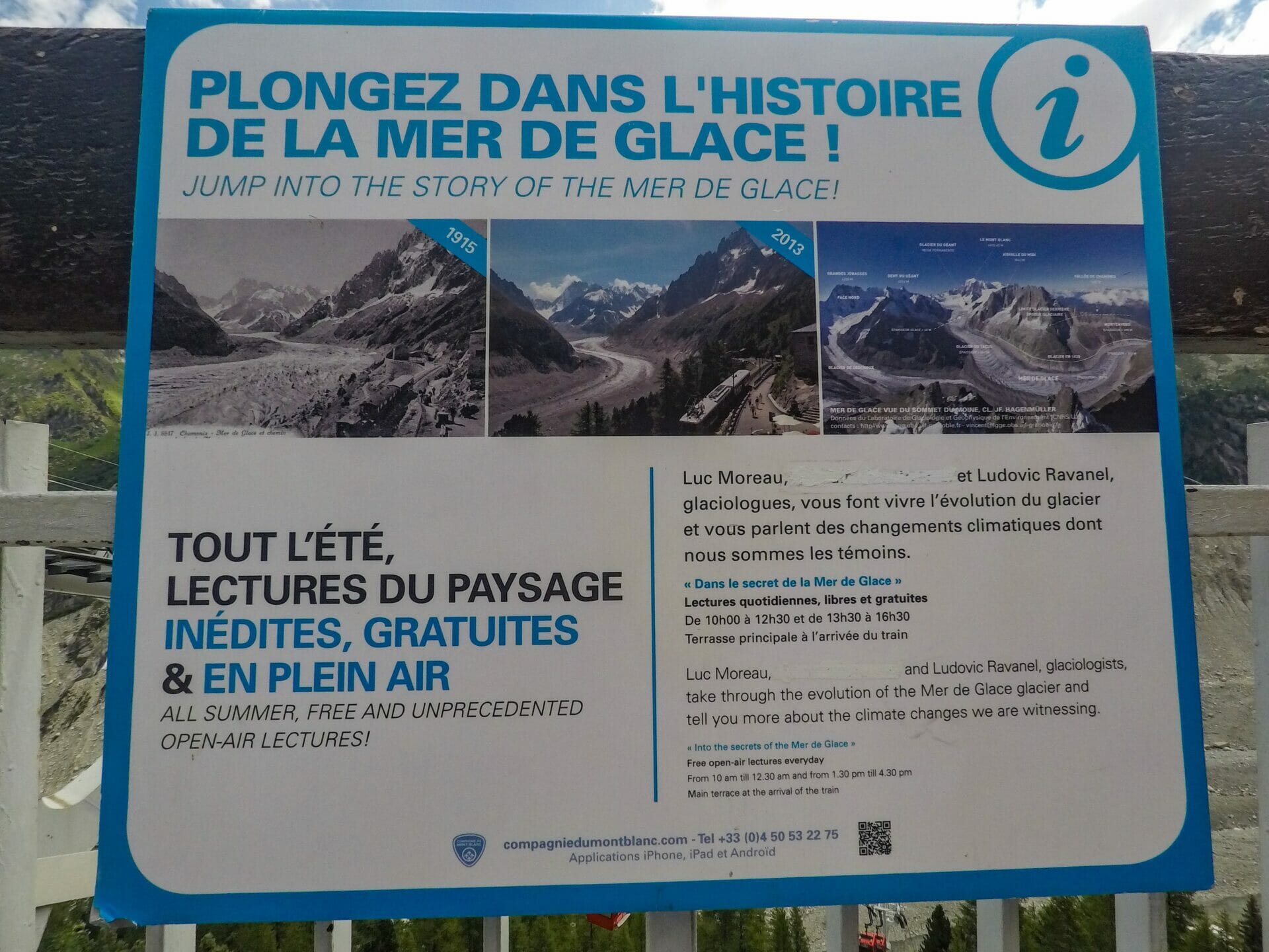 When we arrive, we spend a few minutes taking in the views over the receding Mer de Glace and the mountains before boarding a cable car and descending towards the ice cave. Once out of the cable car, there are 500 steps to descend (which proves a painful task for my knee, especially since I didn’t bring my brace). On the way down, plaques mark the level of the glacier at previous years― a sad but fairly inarguable testament to global warming.