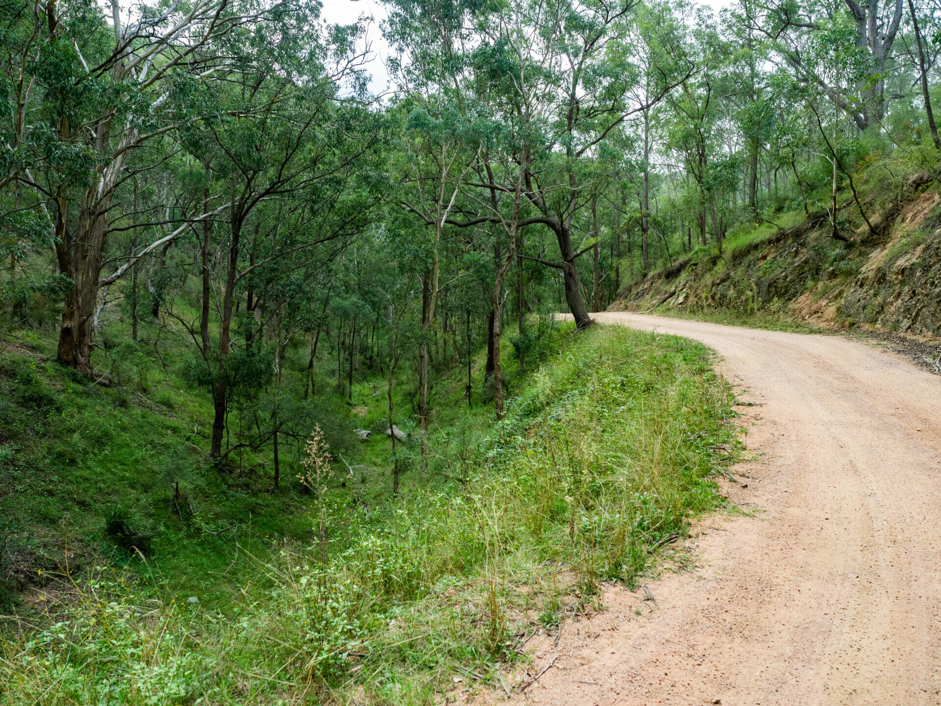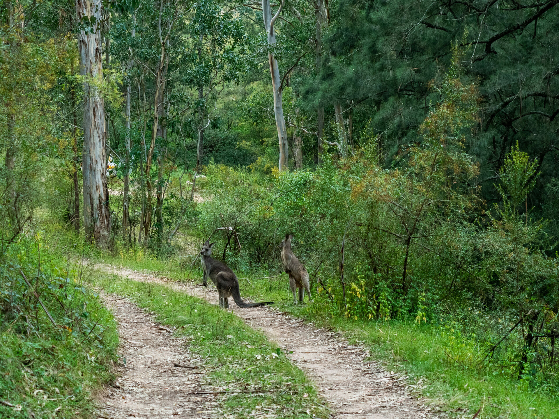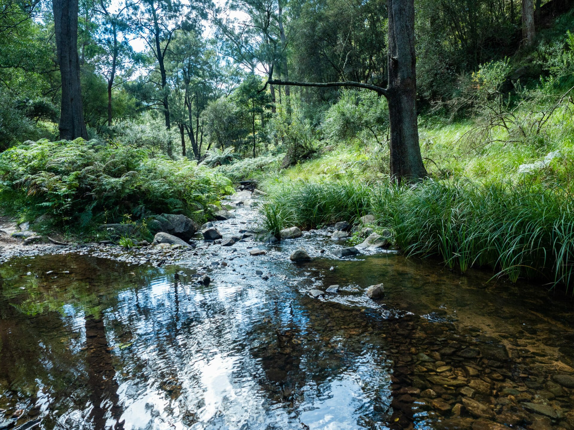 The morning passes easily, but unfortunately without much visual interest— a majority of the walk is on wide gravel fire trails or dirt vehicle tracks and is sheltered by gums on all sides. As we approach Alum Creek, the trail descends even more steeply and begins to wreak havoc on my granny knees, but thankfully the views open up here to the expansive blue gum valleys all around us, providing a very welcome distraction.