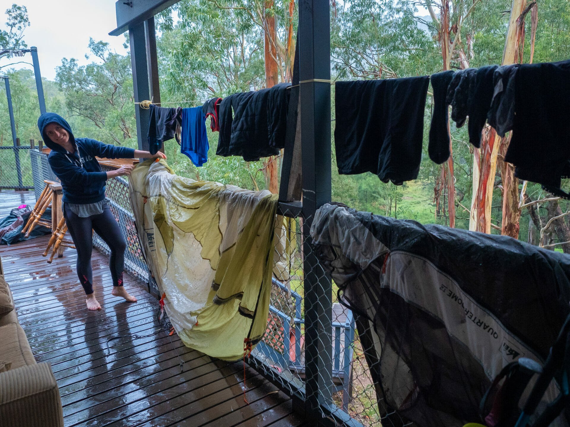 Moments later, our wet clothes and the saturated tent are hung on the line, our boots are propped up near the fire, and all of our valuables have been carefully assessed for damage (the only casualty is my phone, which got quite a soaking in the hip belt of my pack and appears to have suffered some unfortunate water damage). We set up on one of the outdoor tables to watch the storm come to a close while sipping on some cup of soup and cackling at our own misfortune. Still, unintentional detour and all, we both feel as if this must have been fated— if we hadn’t taken the wrong path at the fork and come back to the river, we’d be stuck in the rain halfway to Megalong with no possible shelter and no hope of staying in a dry bed.