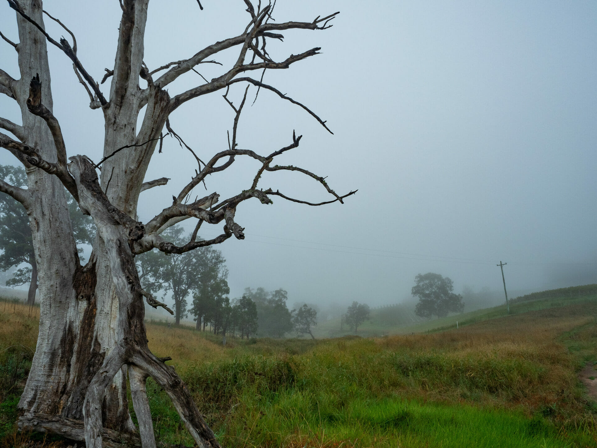 Once on the opposite side of Cox River, the morning is a mix of up and down along a narrow trail all the way to Megalong Valley Cemetery, whose nearby campground we had intended to stay at last night (despite the weather having different plans for us). It’s fairly cool this morning and the whole valley is covered in a thick fog, which lends the walk some mysterious vibes and also a very pleasant temperature.