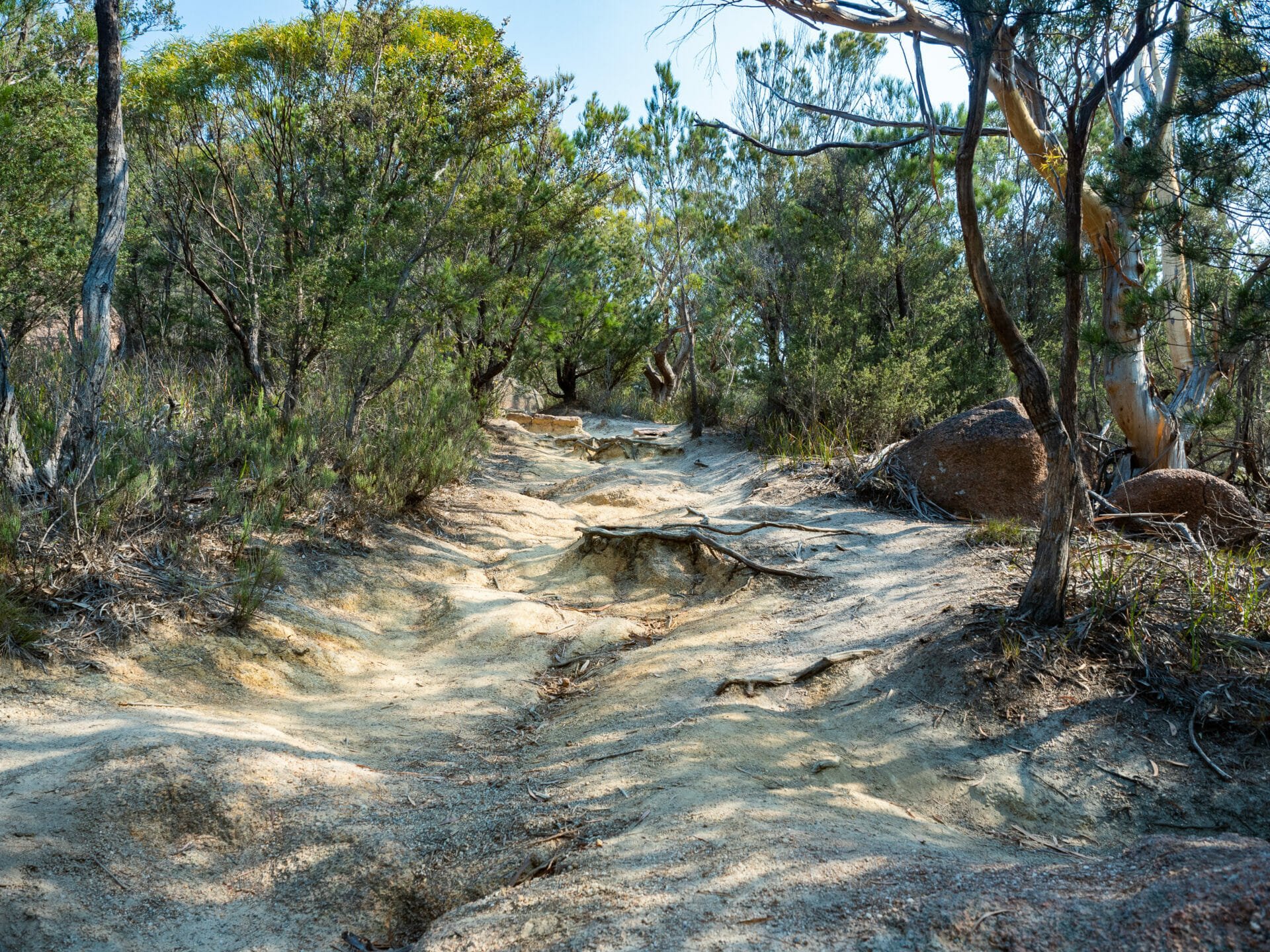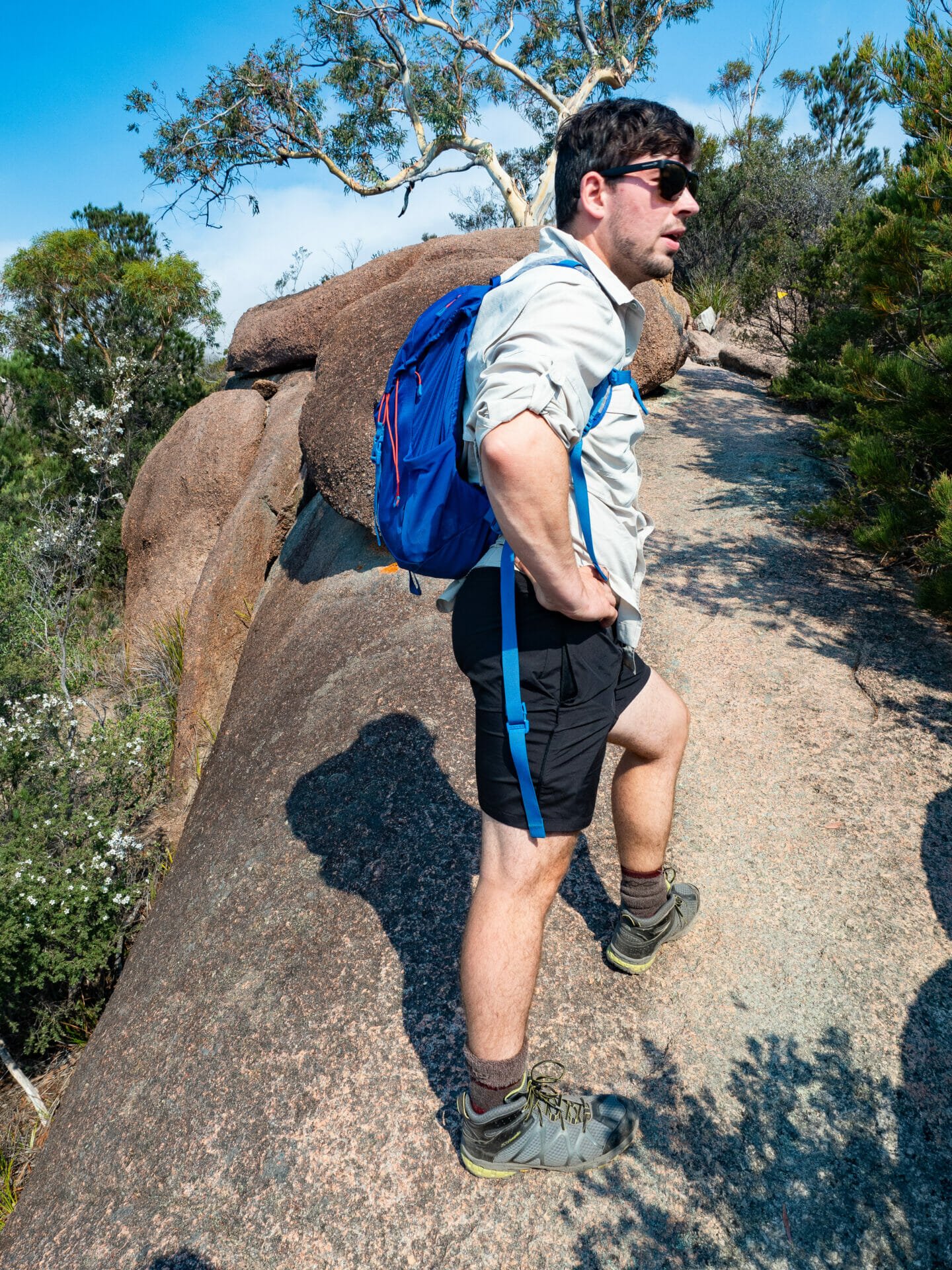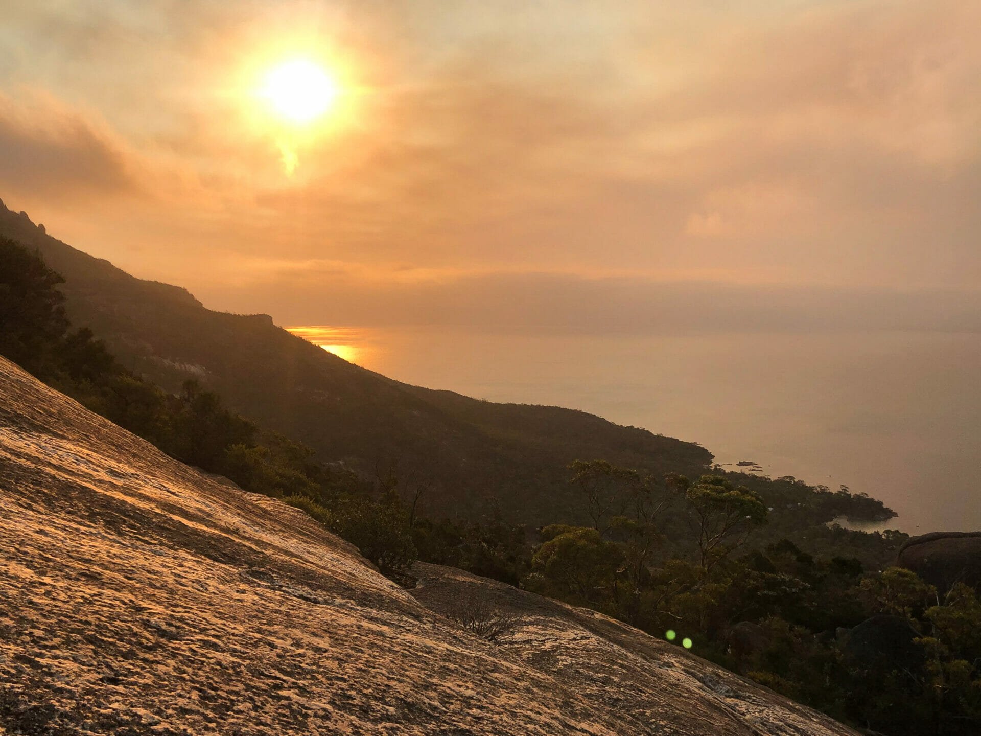 We set off from the Wineglass Bay Walk carpark just after 5pm to make our first ascent of Mt Amos (which, at the time, was also intended to be our only ascent, but we just couldn’t stay away). There is some residual wildfire smoke lingering in the air and heavy clouds are beginning to move in directly overtop, but we are still optimistic that the views from the summit will be worthwhile.