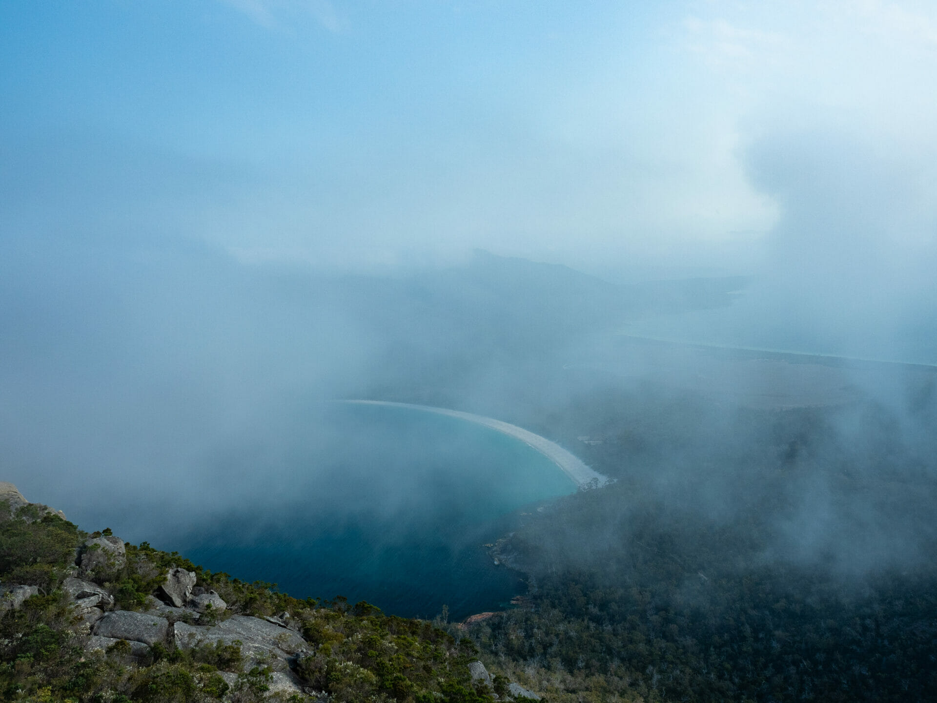 The sun has been slowly creeping down during our climb, covering the coastline in a beautiful golden glow that has made for some wonderful photos back onto Coles Bay. By the time we are within a few metres of the summit, though, a thick layer of clouds have caught on top of the mountain and we have to finish the last steps of our ascent in nearly blinding fog, which obviously does not bode well for our view over Wineglass Bay. Indeed, when we arrive at the top and peak over the side, there’s nothing but white cloud as far as the eye can see. We linger for close to an hour, enough time to catch some very enticing glimpses of the Bay, but just not enough to satisfy me, which means that we have no choice but to make a second go of it in the morning— I’ve invested too much to go home without this view!