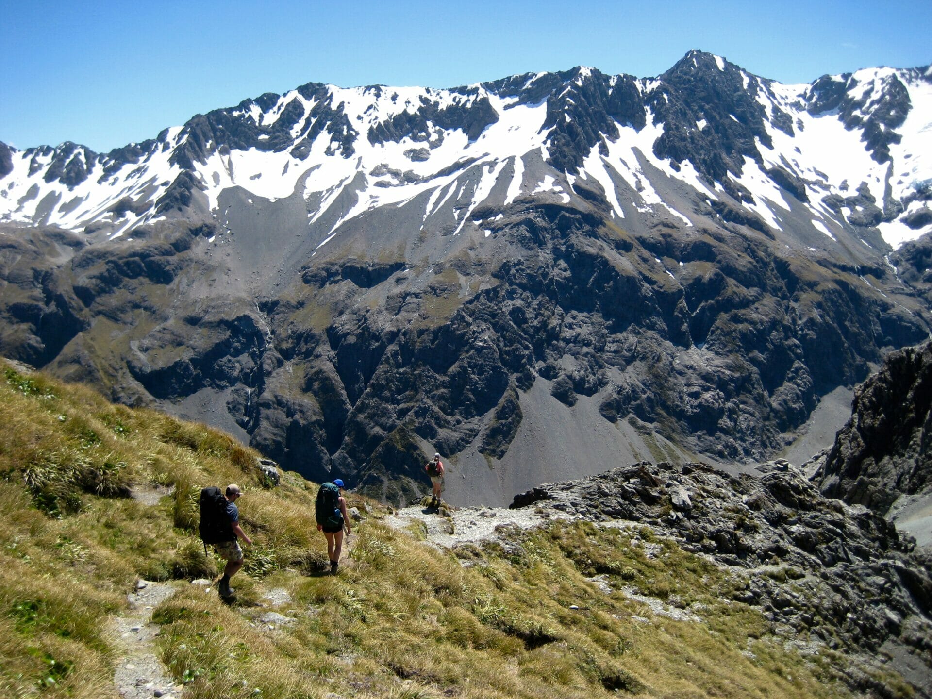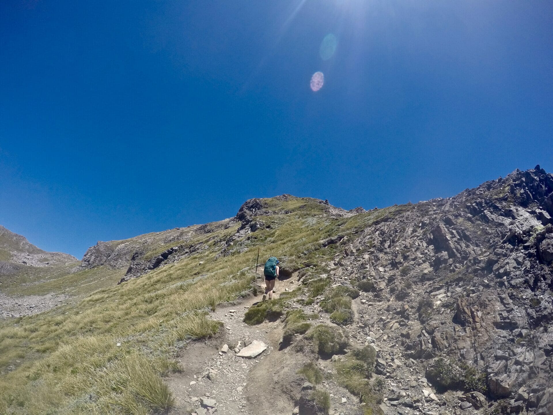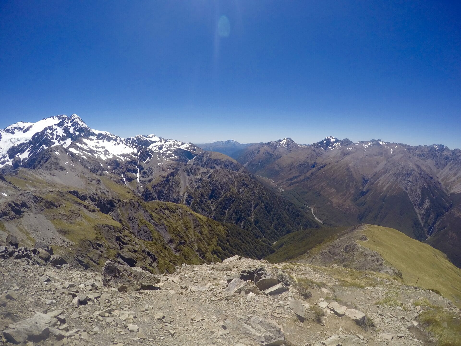 Though it’s been summer in New Zealand all this time, the weather only just seems to have caught on, so we begin our crazy upwards climb in sweltering heat and direct sunlight, a combination I would never have elected for, if the weather had been kind enough to actually ask what I wanted. In a number of hours, we reach Avalanche Peak and sit on the summit to eat lunch. There are a few other hikers eating next to us, everyone in high spirits after having made it to their destination. Despite not having yet arrived at our final destination of the day, I am also in high spirits, since the worst heat is over and our path looks delightfully level from here.