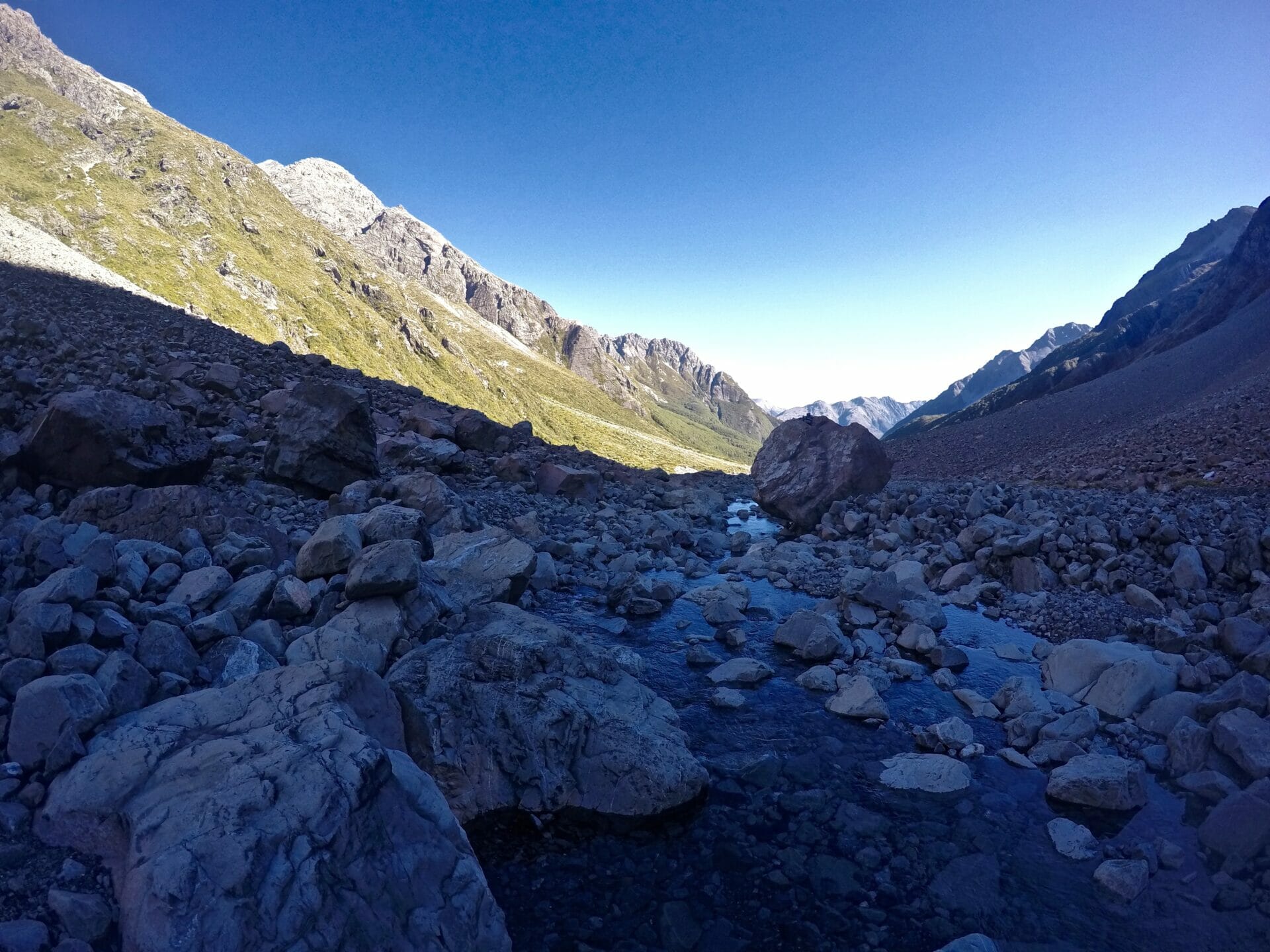 Despite too many close calls to count, we make it to the base of the hill after several hours and a lot of bleeding. The first thing Cal and I do is strip off our hiking clothes and sit in the icy creek, trying to numb some of the scrapes and bruises. The rest of the journey to Crow Hut is reasonably flat, but certainly not on flat ground. Exhausted, we crawl slowly across huge boulder fields and through pokey scrub, nearly resigned to just dying in the wilderness. By the time we make it to the hut, where 2 other hikers are cooking dinner, we understand why this hut is so much less crowded than all the others we have visited on this trip.