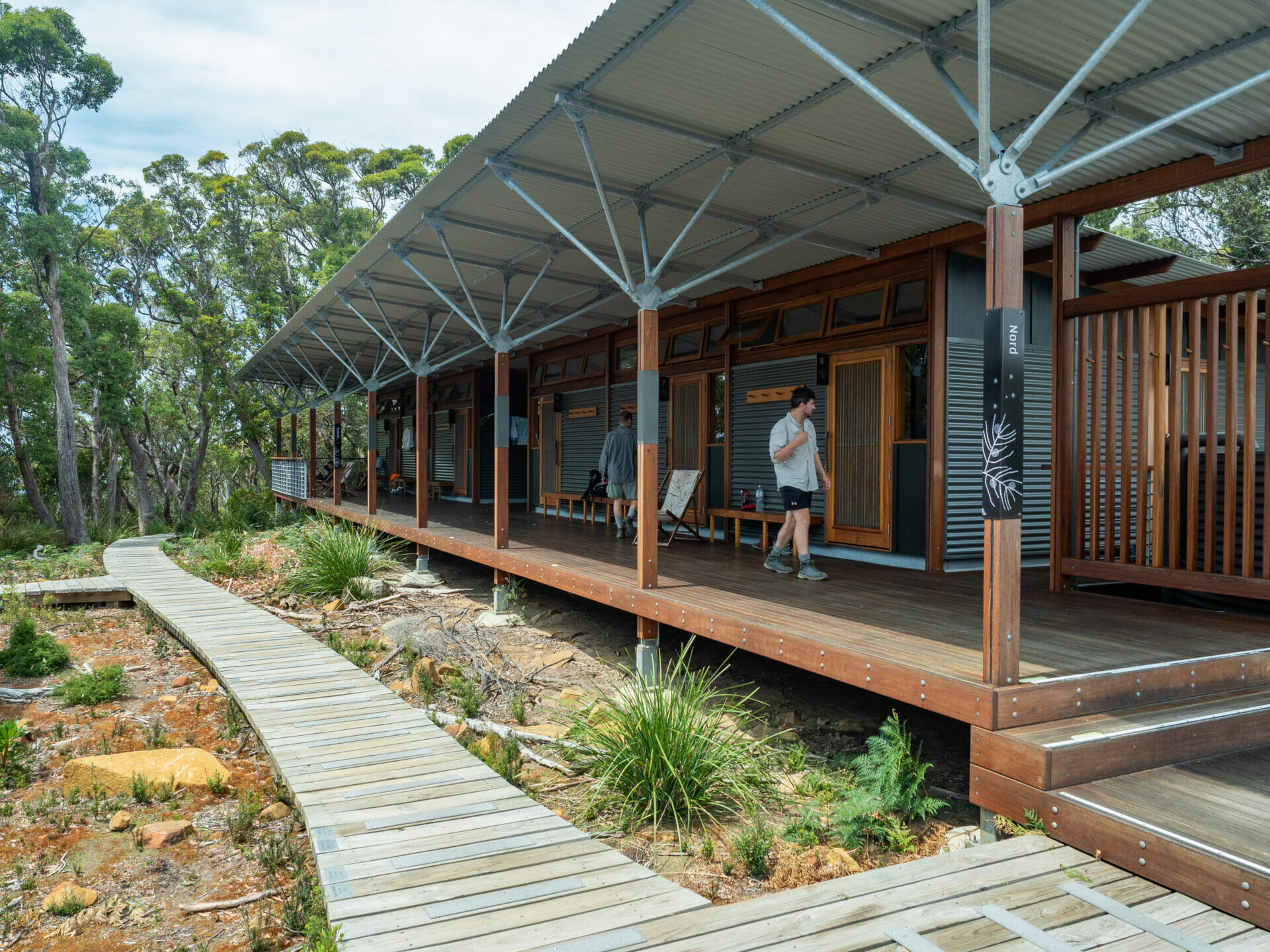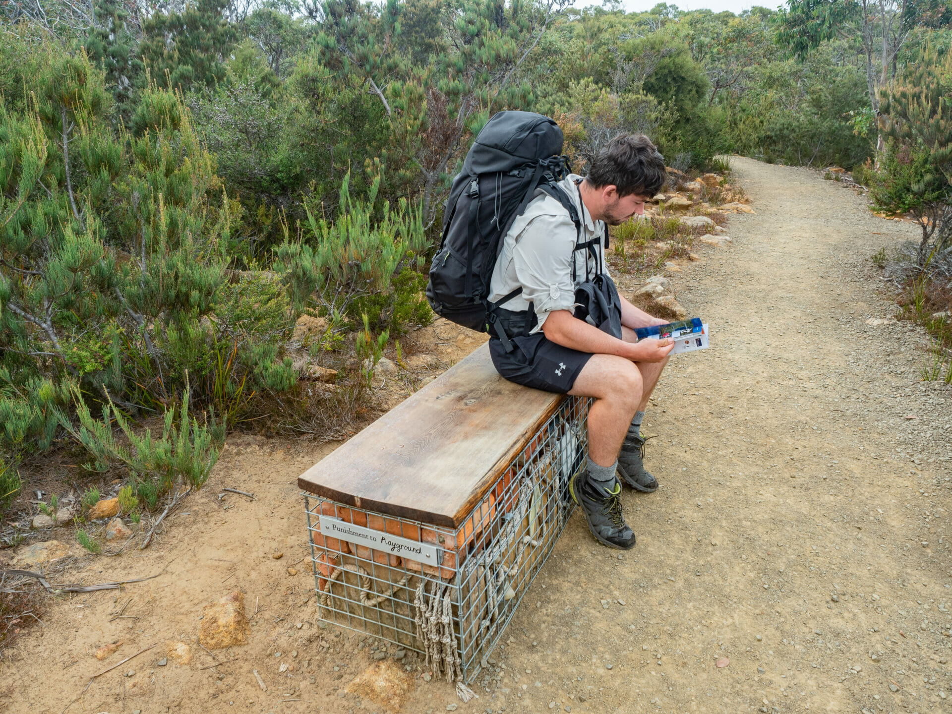 After a beautiful night’s sleep on the heavily cushioned bunks at Surveyors Hut and a quick breakfast of mountain burritos, Cal and I hit the trail, courteously leaving dad and Eileen to tidy up the bunkroom behind us. Not long into our flat walk on a gentle gravel trail, we reach our first storyseat of the morning and read about the incredible revamp of the Port Arthur area from a “once dreaded and most vile spot” to one associated with unmatched coastal beauty and outdoor adventure. After spending a very full day prior to our hike exploring the historic penitentiary and surrounds, we too have seen how this area was transformed from a place of horror and hardship into the wilderness paradise that we are now exploring.