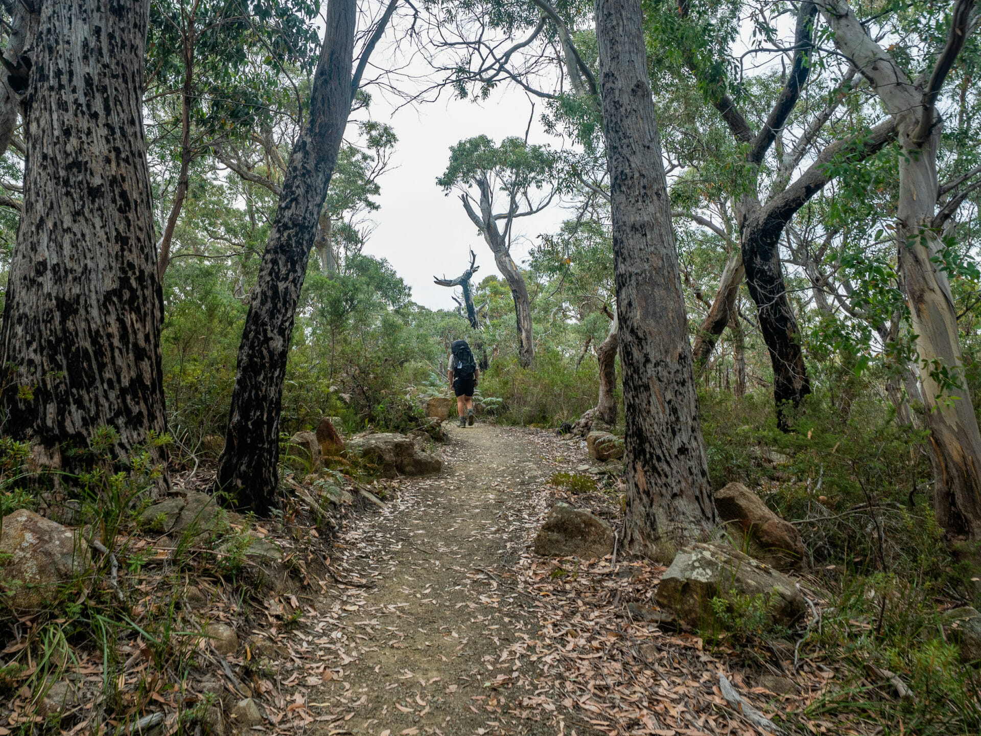 - Walking through the blackened eucalypt forest