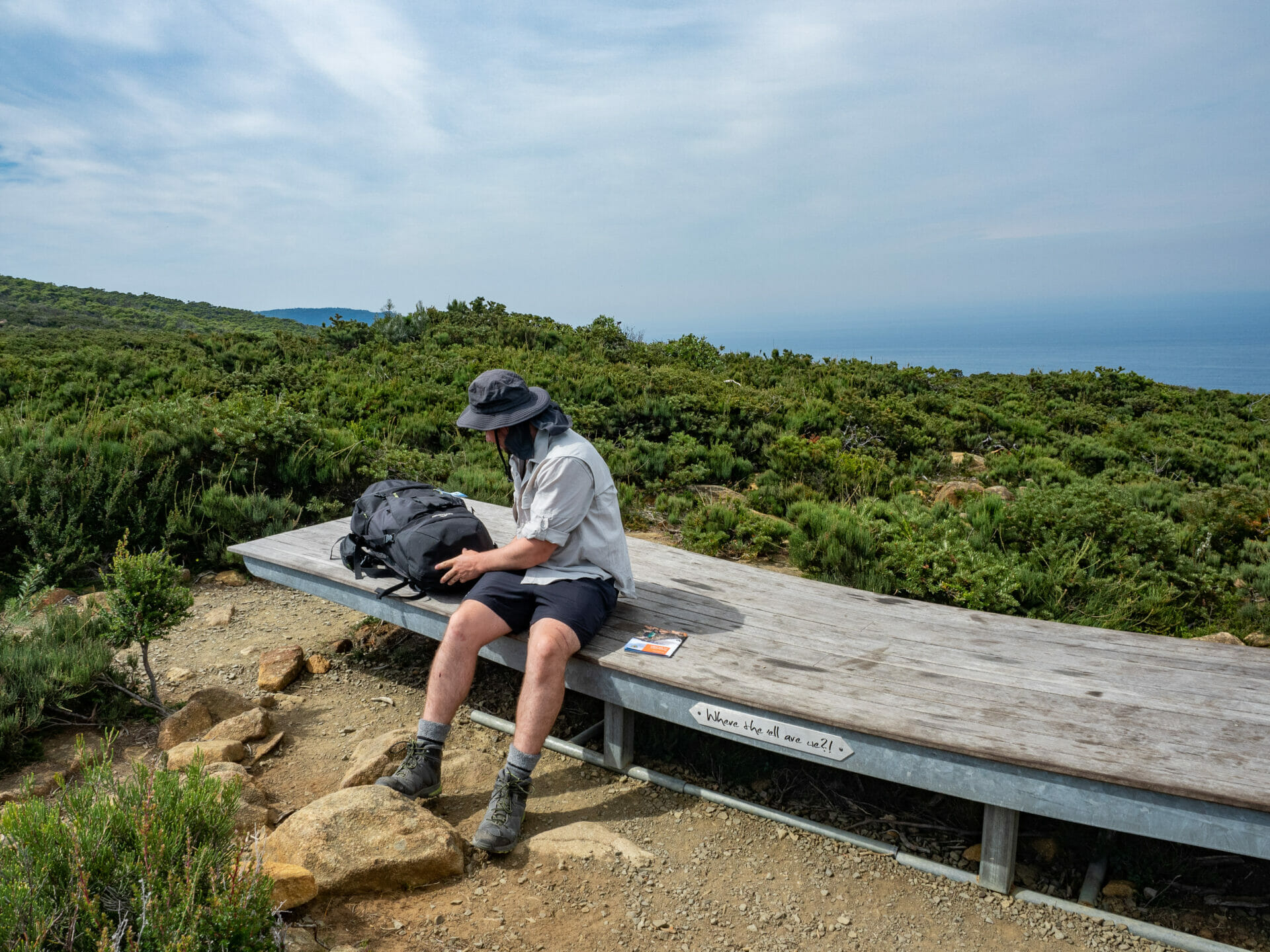 After a few storyseats examining the fungi of the cloud forest and the local flora, our trail levels out across the Ellarwey Valley, an open expanse of wind-whipped coastal heath. There’s a wonderful, large storyseat where several hikers are already perched, and we join for a bit of lunch. Pulling out our sausages and some Gatorade, I read another of our stories, this one featuring excerpts from a 1965 trip report written by two prominent hikers from the Hobart Walking Club. Tim Christie and Reg Williams were some of the first walkers to bush-bash their way from Fortescue Bay to Cape Pillar, giving names to many of the previously undocumented locations as they went, the most notable being “Where-the-freaking-hell-are-we Ridge”, which inspired the official naming of (where the freaking) Ellarwey Valley!