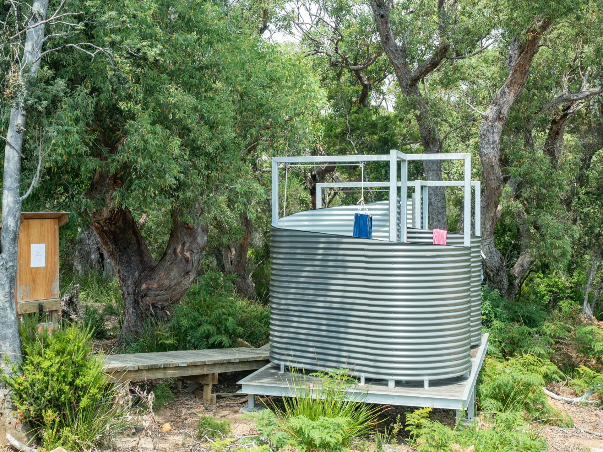 We head straight to bunkroom 3, our assigned room for the duration of the hike, to strip out of our sweaty socks and hop into the shower queue. Munro Hut itself is every bit as beautiful as Surveyors with the large glass windows and endless timber decking, but also has the added excitement of two corrugated iron scrolls at the far side, which serve as bush showers for all the sweaty hikers passing through. I use a heated tap to fill a bucket of hot water for myself, carrying it inside and emptying it into a large plastic bag, which I then hoist above my head and set to lightly drizzle from a shower tap. It feels wonderful to rinse off after a hot day on the trail, and the whole operation is ingenious both in its simplicity and its luxury.