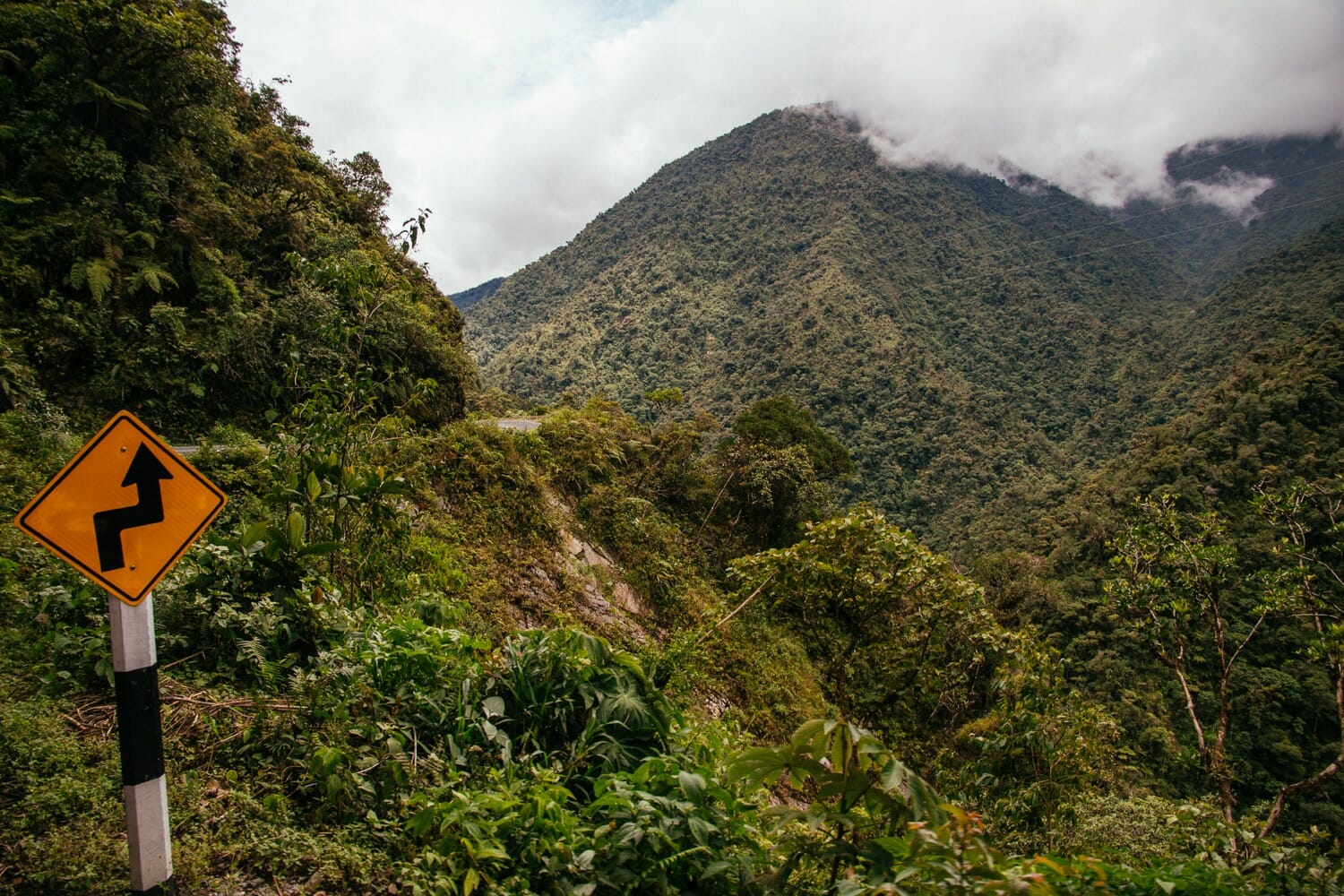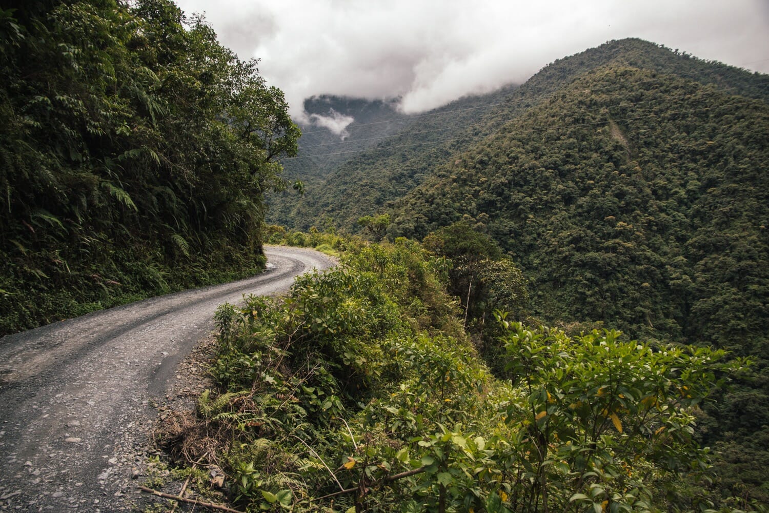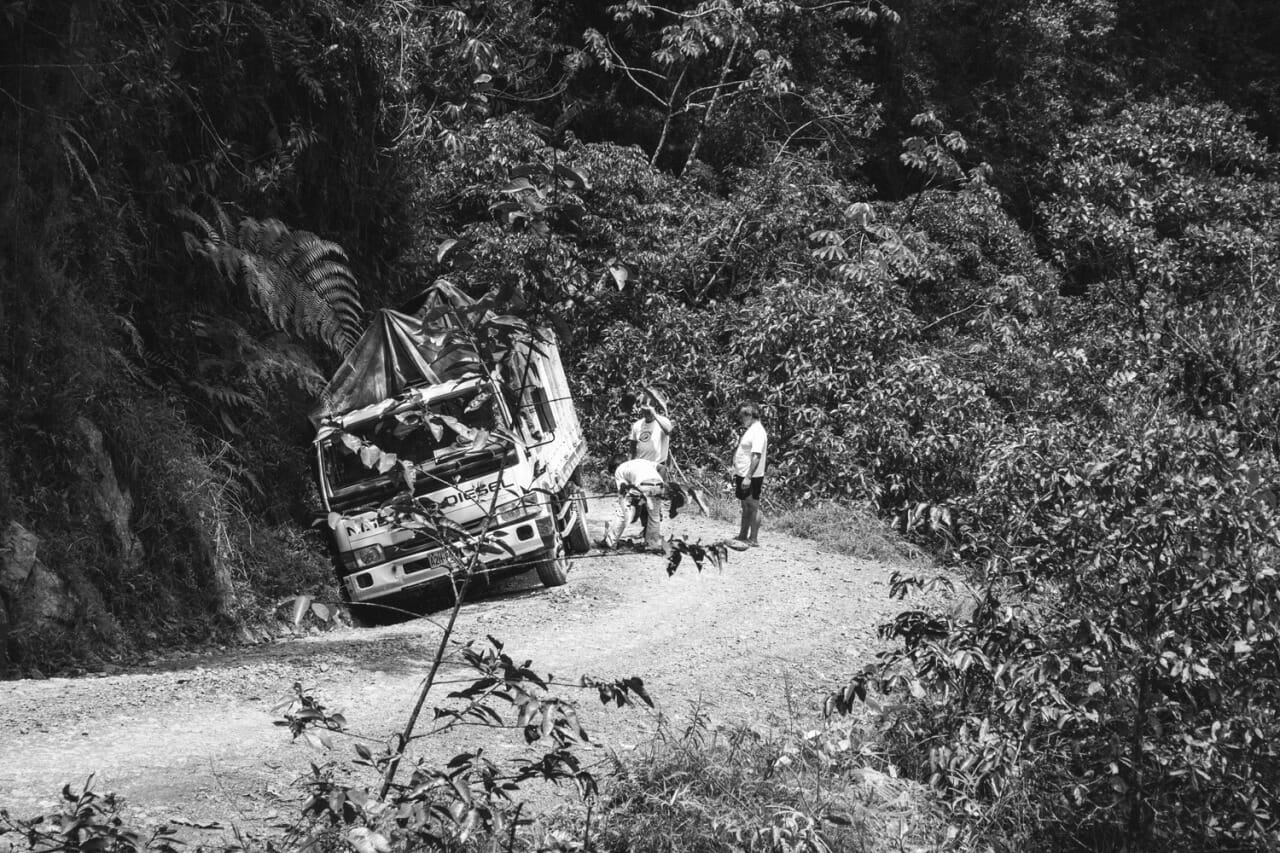 It’s about 9am when we are jolted awake to the site of jungle all around us (!!) and multiple bus wheels off the road. A quick glimpse out the window reveals that “off the road” is a many-hundred metre plunge down a sheer cliff. Aristo is flipping out, but not too much to grab the camera and start getting some great footage as we recover from the slip and continue along the narrowest cliffside road I’ve ever seen. Matters are not aided by the rain, which is making it difficult to see and also quite slippery, but we are giggling with delight at the prospect of getting this on film.