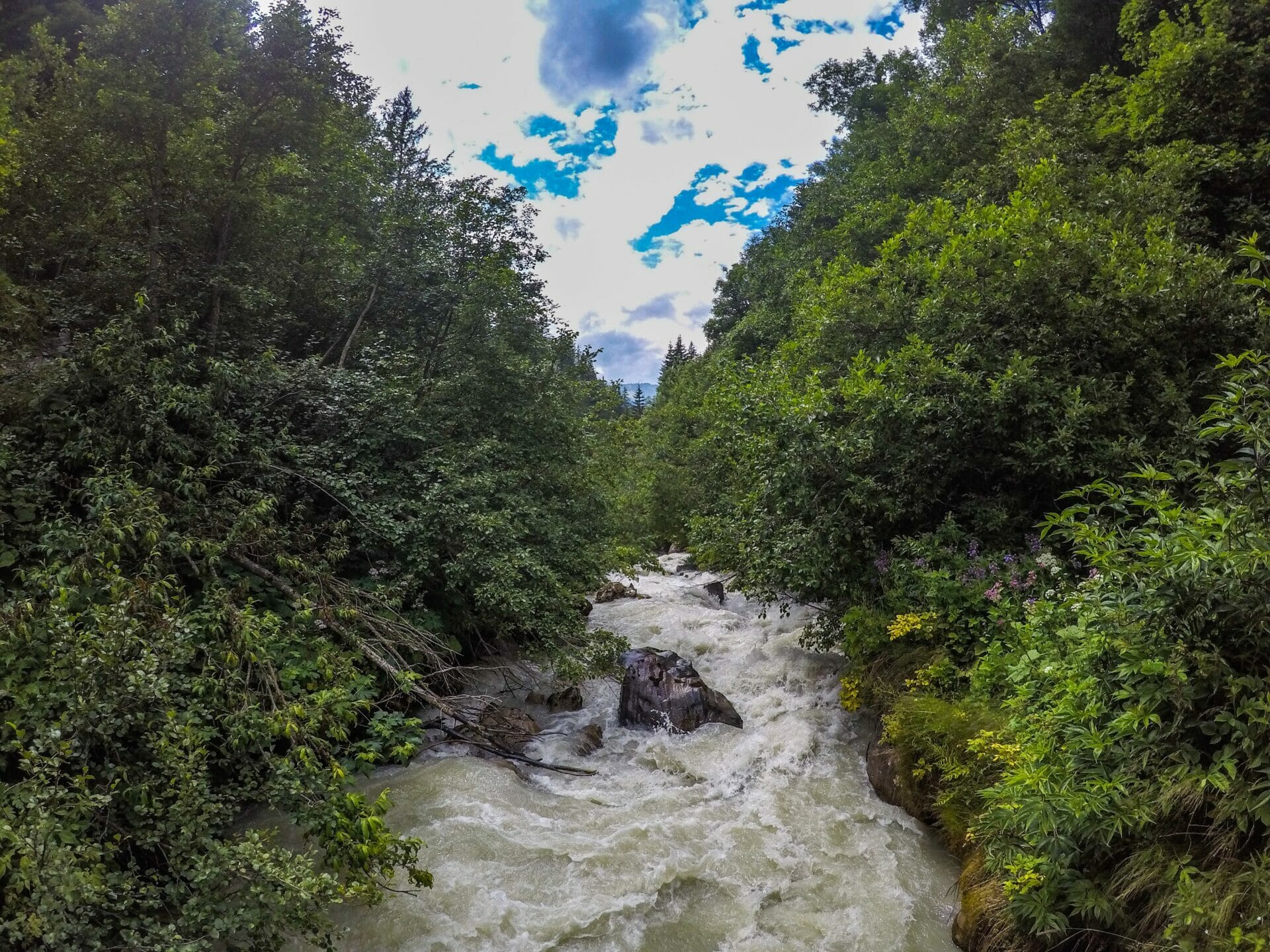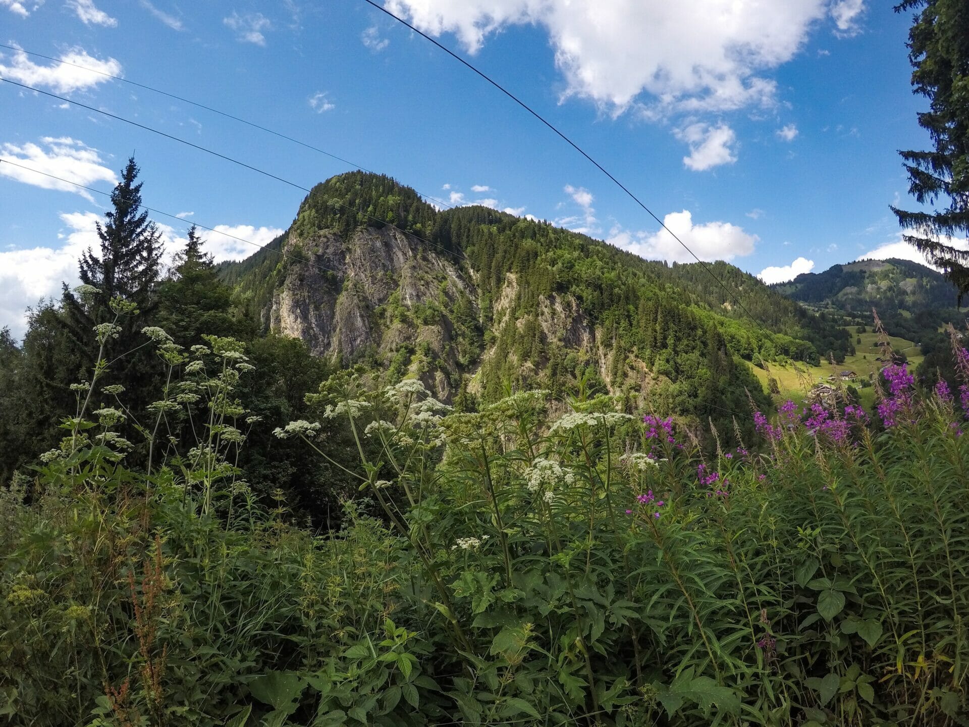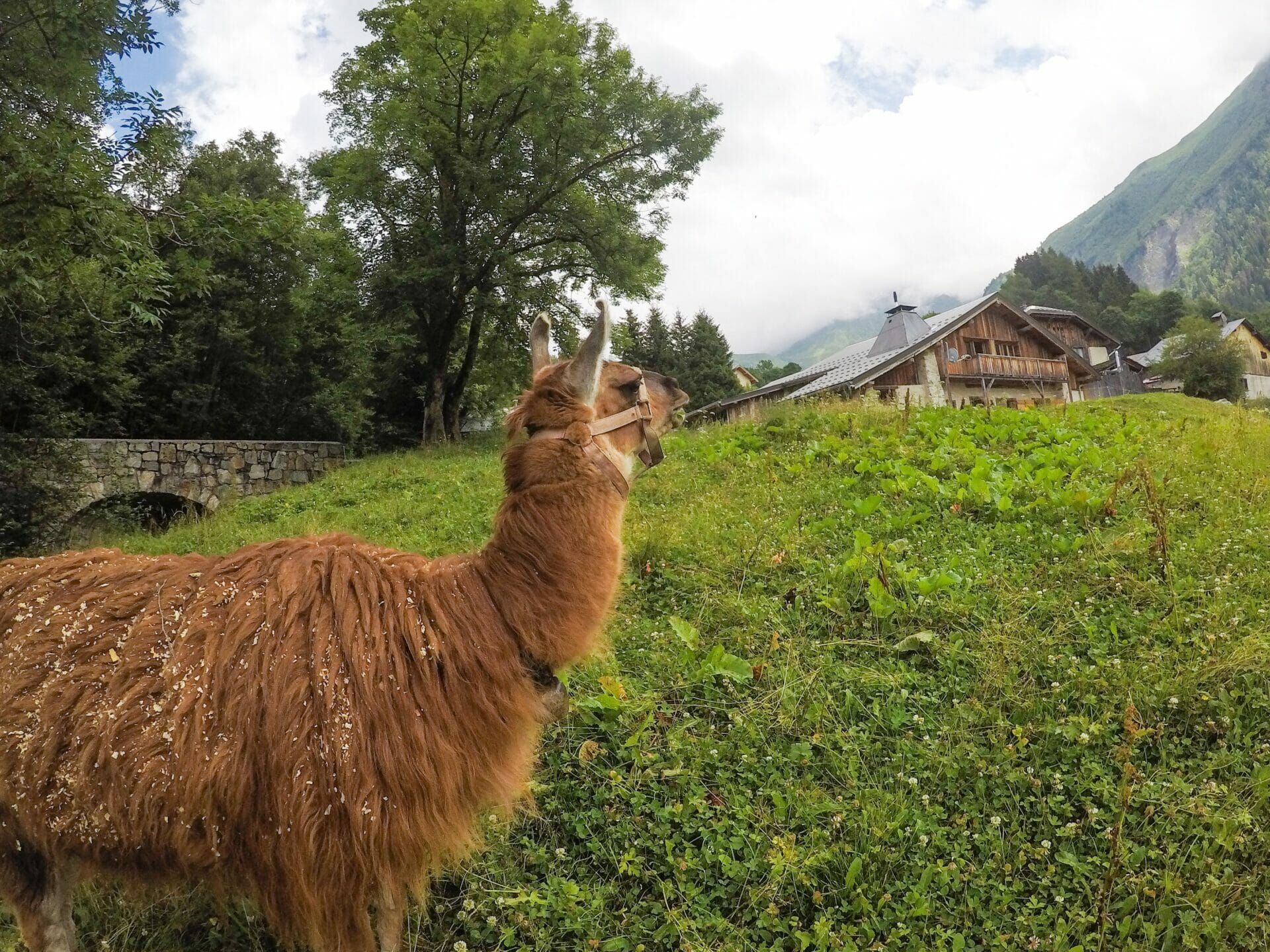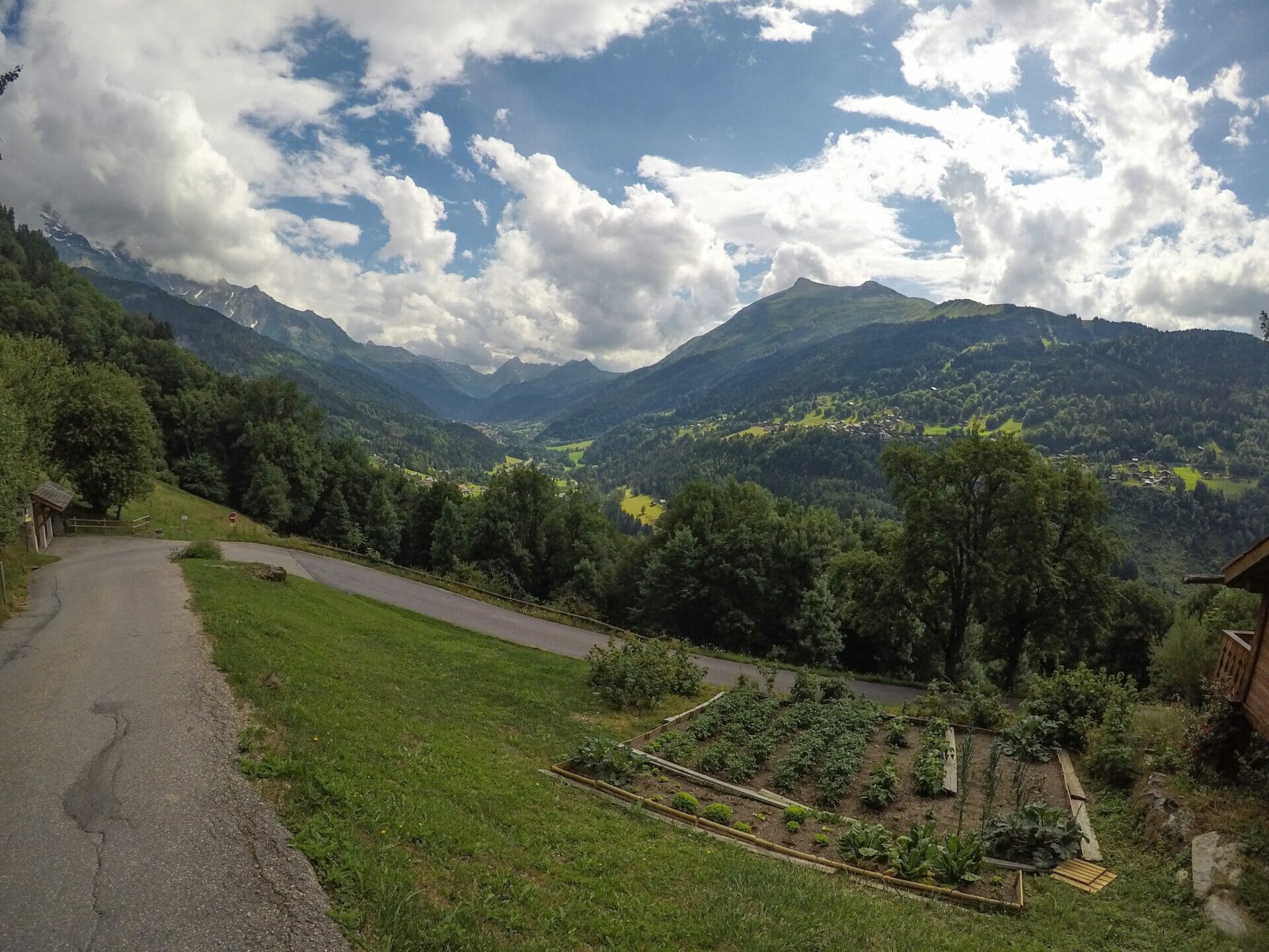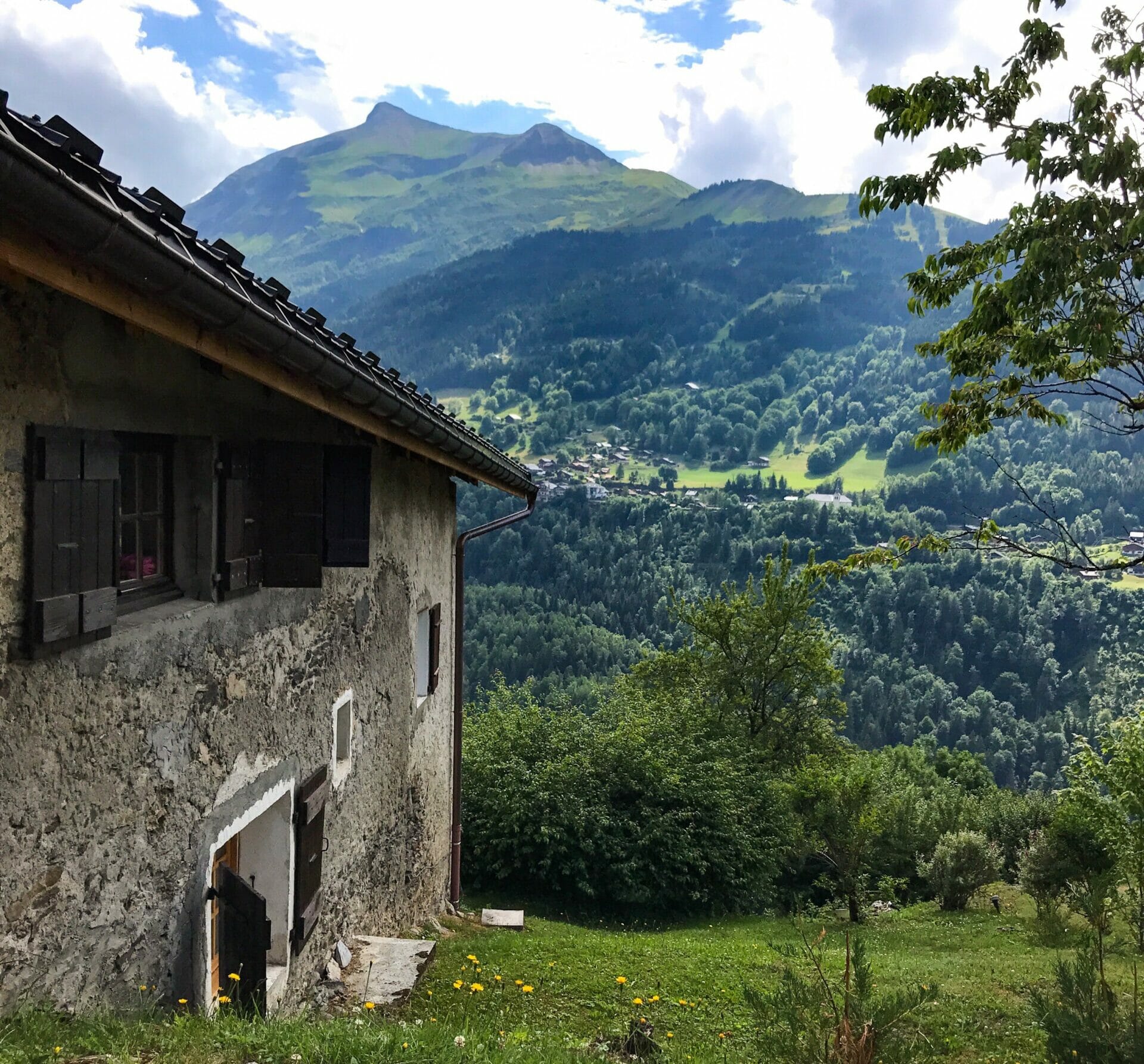 While we are sitting and eating, the clouds start to reveal slightly more of the incredible mountains towering over us. I have a feeling that I’d be weeping happy tears of joy if the full view was visible, so I’m overwhelmingly eager to see more of these incredible mountains in the coming days (and cry my happy tears).After our lunch, we fill up water and cross the tram tracks (while staring longingly at the tram itself), before continuing gently downhill towards Bionnassay, a delightful and very French town in the hills. The walk is just under an hour and we are feeling full of energy after our lengthy rest in the grass and a few sneaky handfuls of Skittles, so it positively flies by.