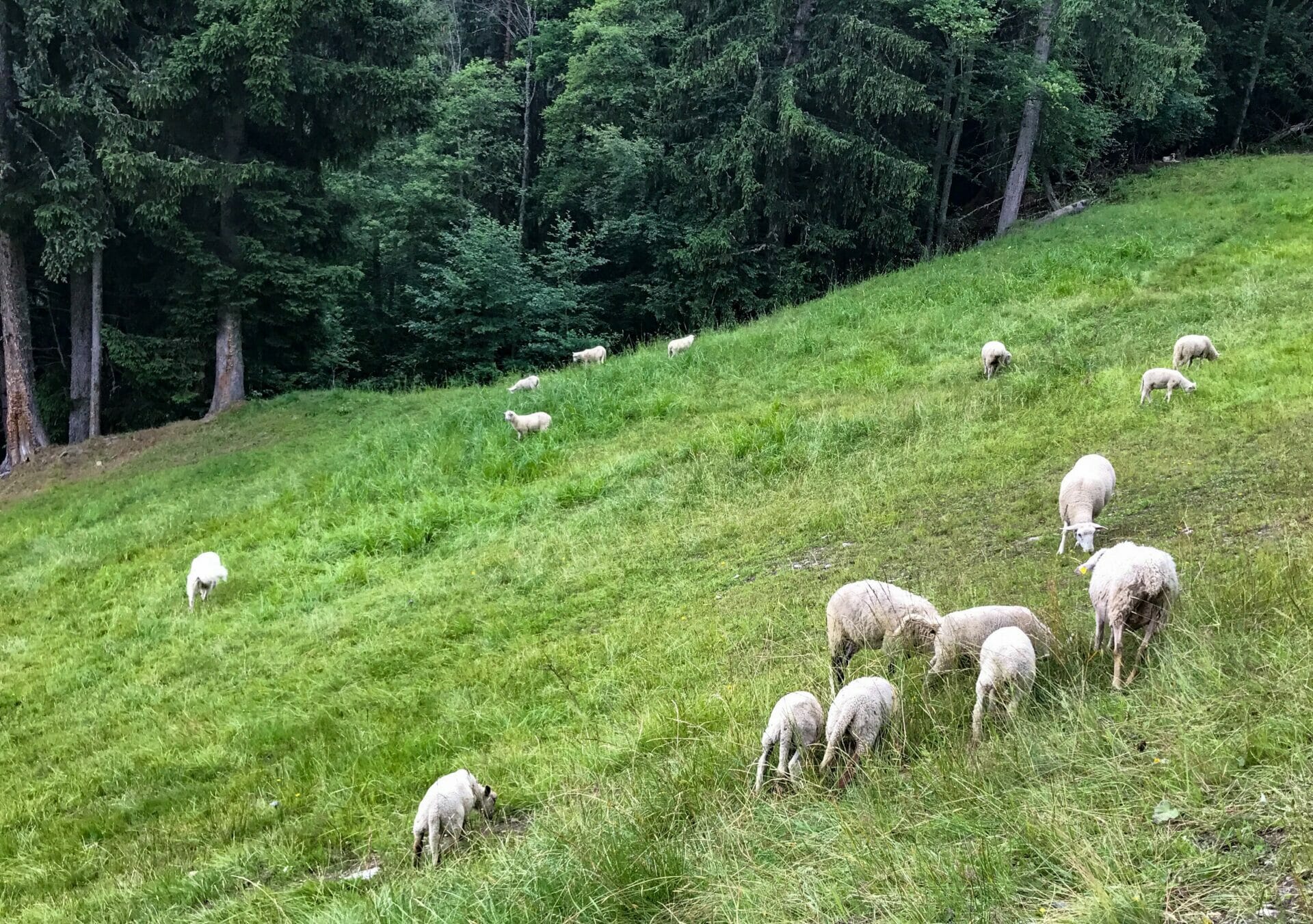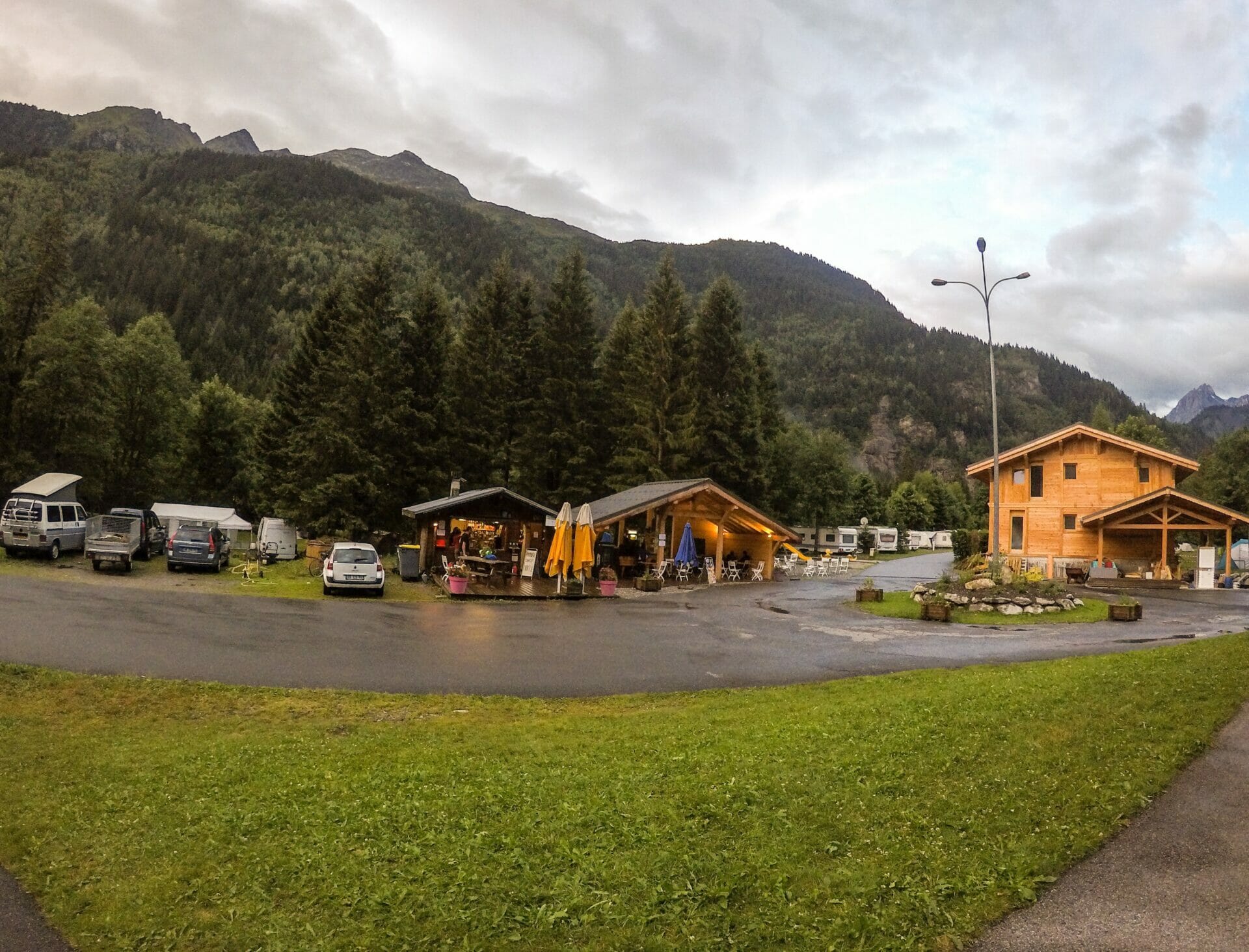 Over an hour later, the rain has increased considerably and we pop out of the forest into Les Contamines, very eager to reach our campsite. We walk a few metres to the tourist information office to enquire about camping, and are told that Camping Les Pontet is actually an hour away by foot. Looking outside, where a full-blown thunderstorm has begun, we are pretty disheartened by the prospect of further walking and eagerly accept information on the free shuttle that can deliver us there, hopefully a bit dryer.