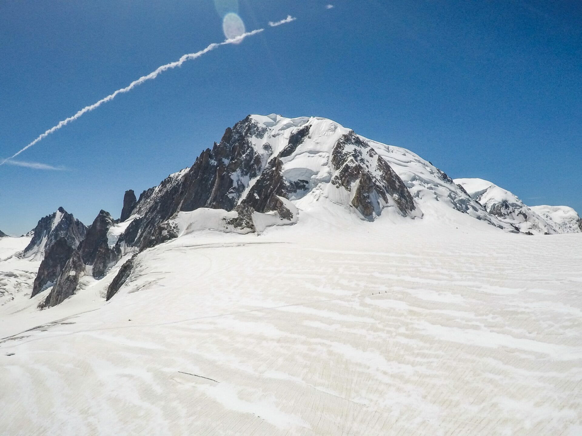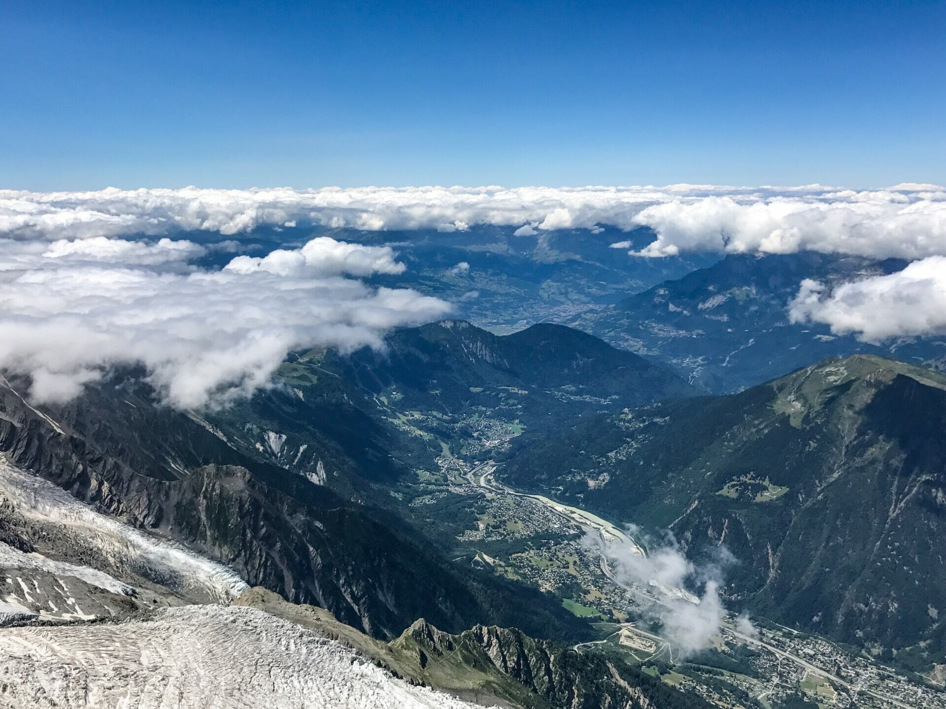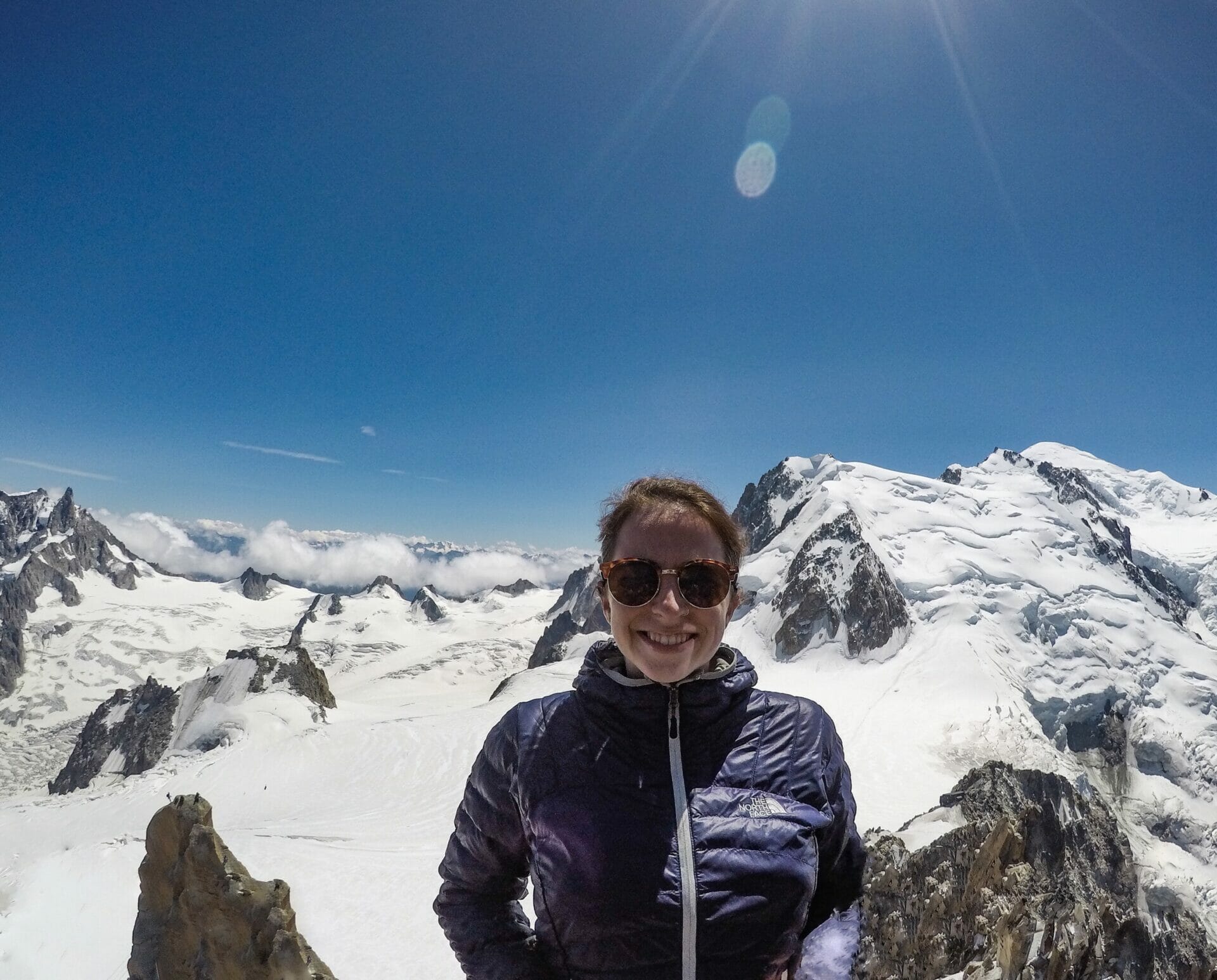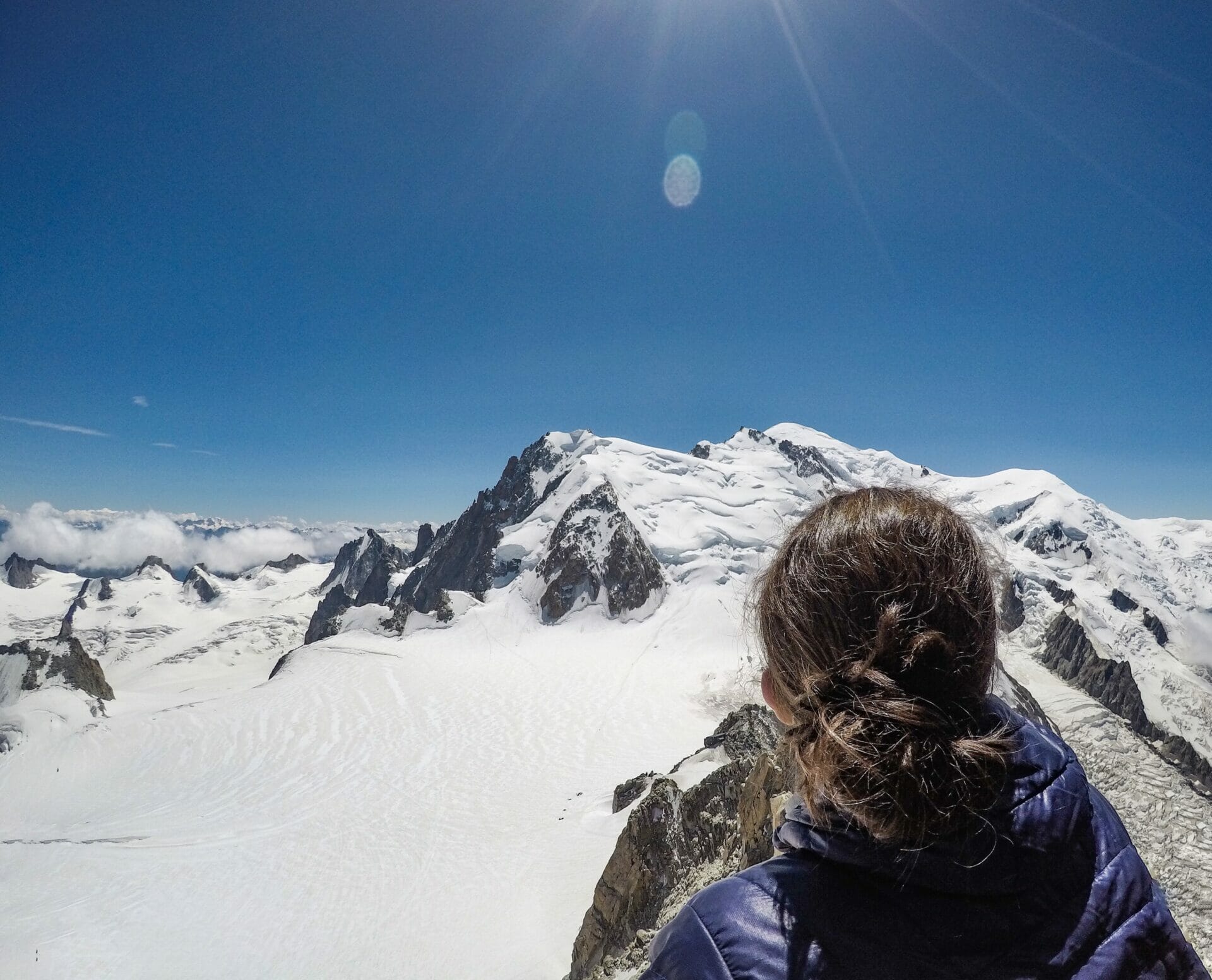 We are both a bit hangry at this point, but the 15 minute wait is well worth it when we reach the top and look nearly head-on at Mont Blanc. Katy reckons one of the smaller peaks is more spectacular, but I just can’t get enough of the main event.