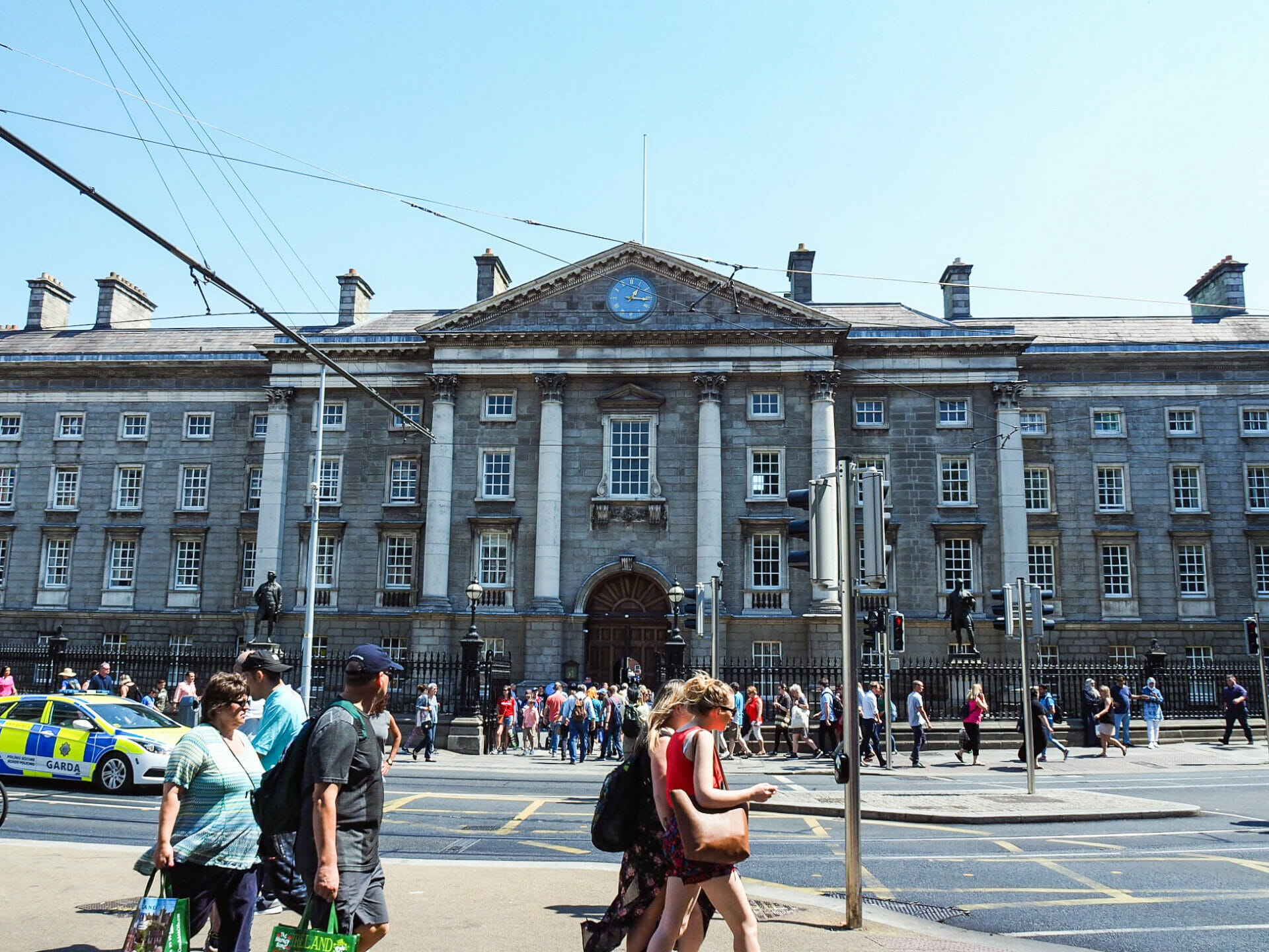 Our final stop of the tour is Ireland’s oldest and most prestigious university, the beautiful Trinity College. We wander through an enormous door in the impressive façade and into the leafy courtyard, flanked on all sides by historical buildings, many of which are student accommodation, society headquarters, and dining. It’s free to explore the university yourself (having now left the free walking tour), but there is also a paid tour, led by students, that will provide further insight into the history of the College, as well as access to the university’s most impressive building, the Long Room Library.
